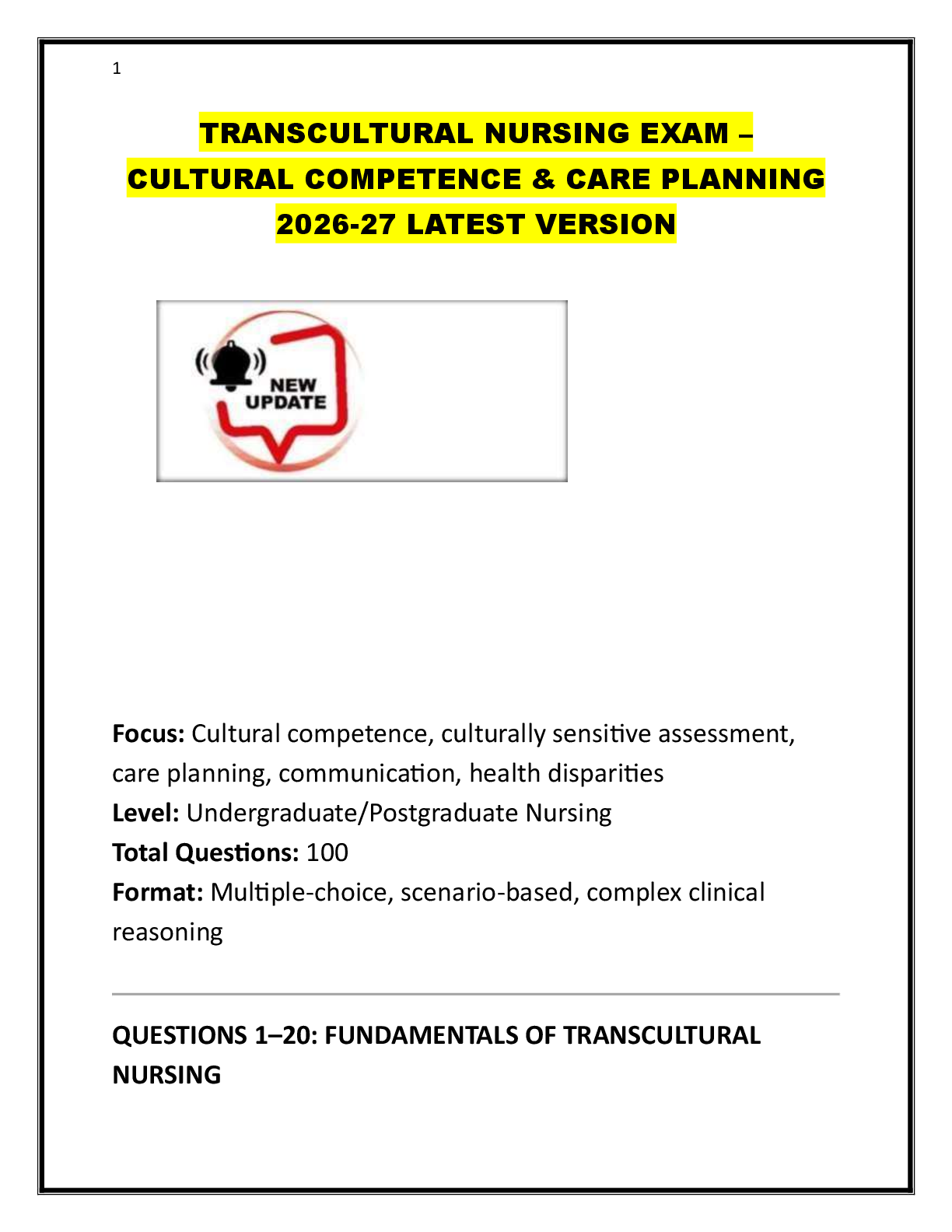 *NURSING > EXAM > TRANSCULTURAL NURSING EXAM – CULTURAL COMPETENCE & CARE PLANNING 2026-27 LATEST VERSION