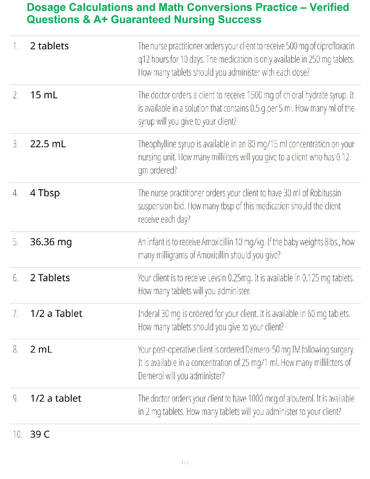 *NURSING > QUESTIONS & ANSWERS > Dosage Calculations and Math Conversions Practice – Verified Questions & A+ Guaranteed Nursing Success