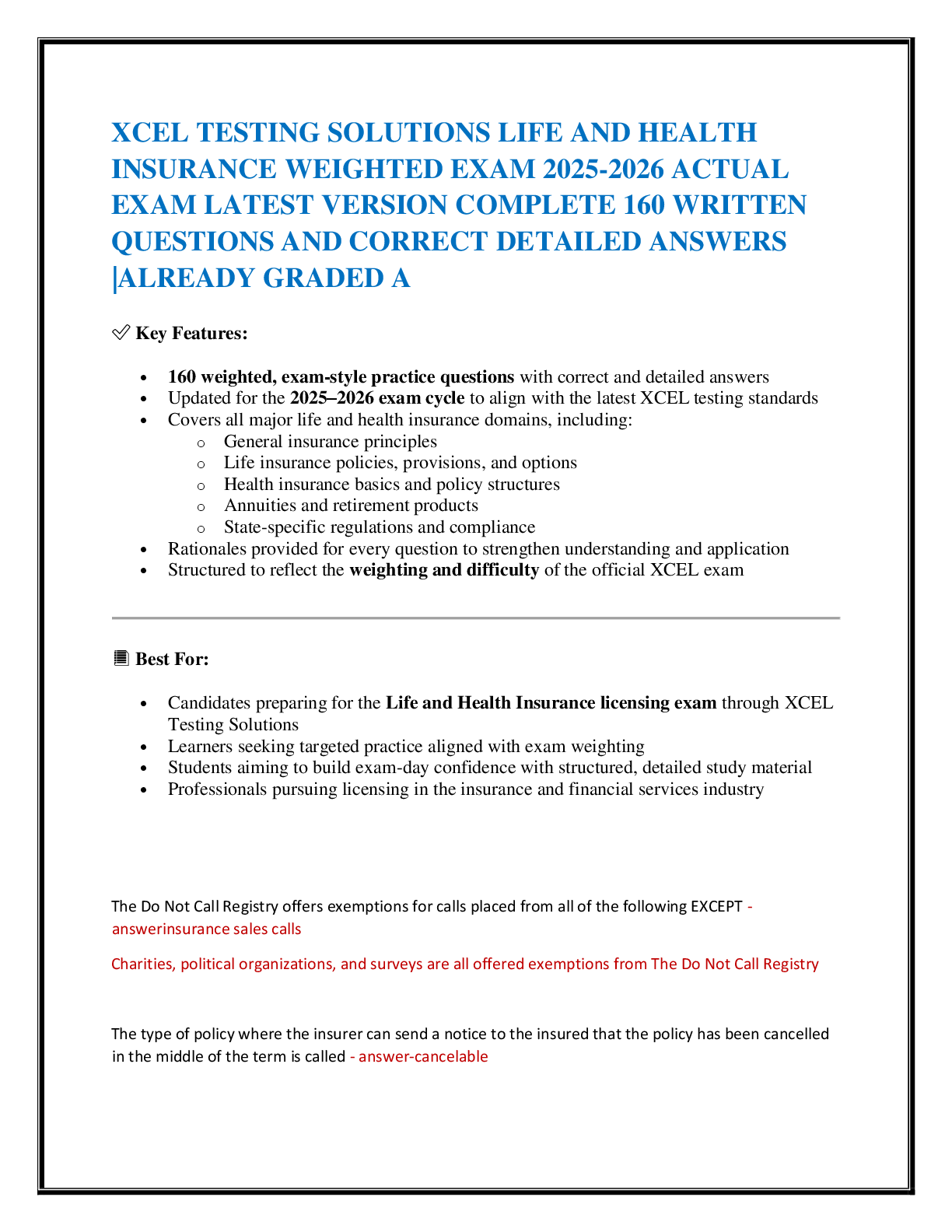 Business > EXAM > Xcel Testing Solutions- Life and Health Insurance- Weighted Exam- Questions/ Q&A 2025
