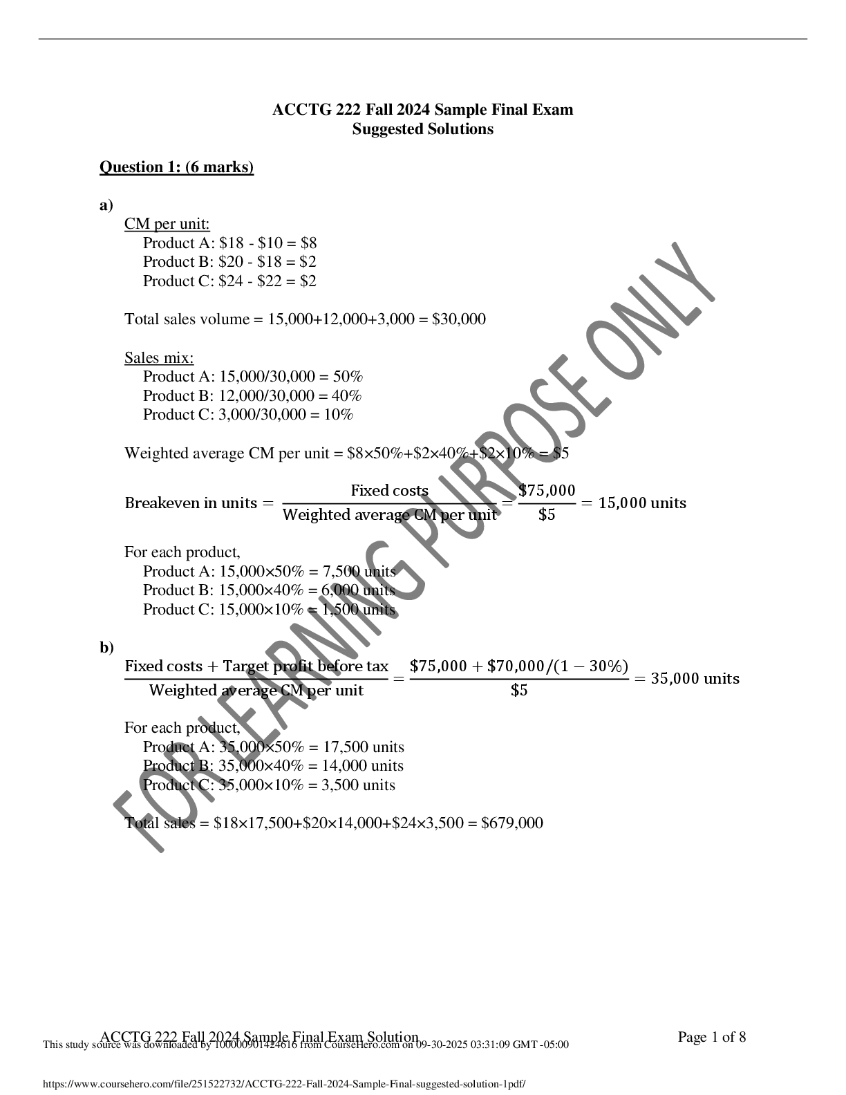 *NURSING > EXAM > ACCTG 222 Fall 2024 Sample Final Exam Suggested Solutions