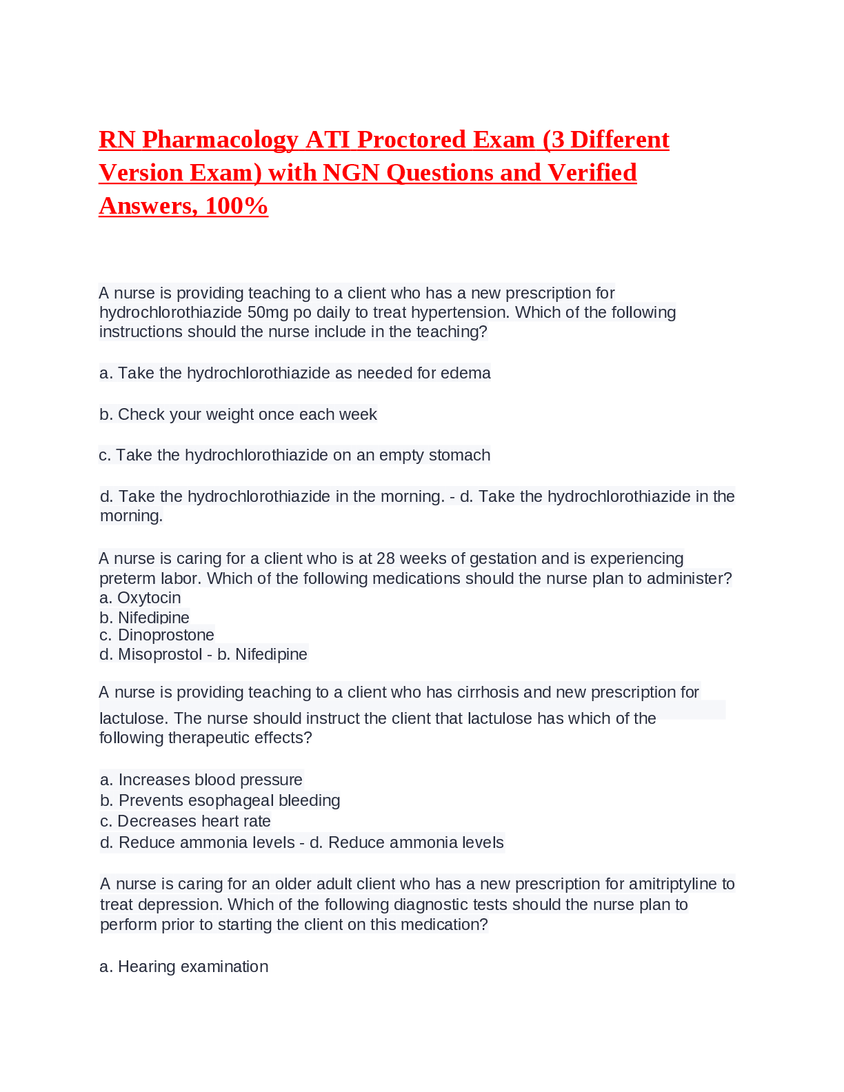 ATI RN PHARMACOLOGY > QUESTIONS and ANSWERS > Pharmacology ATI Proctored Exam 2026 (3 Different Version Exam) with NGN Questions and Verified Answers, 100%