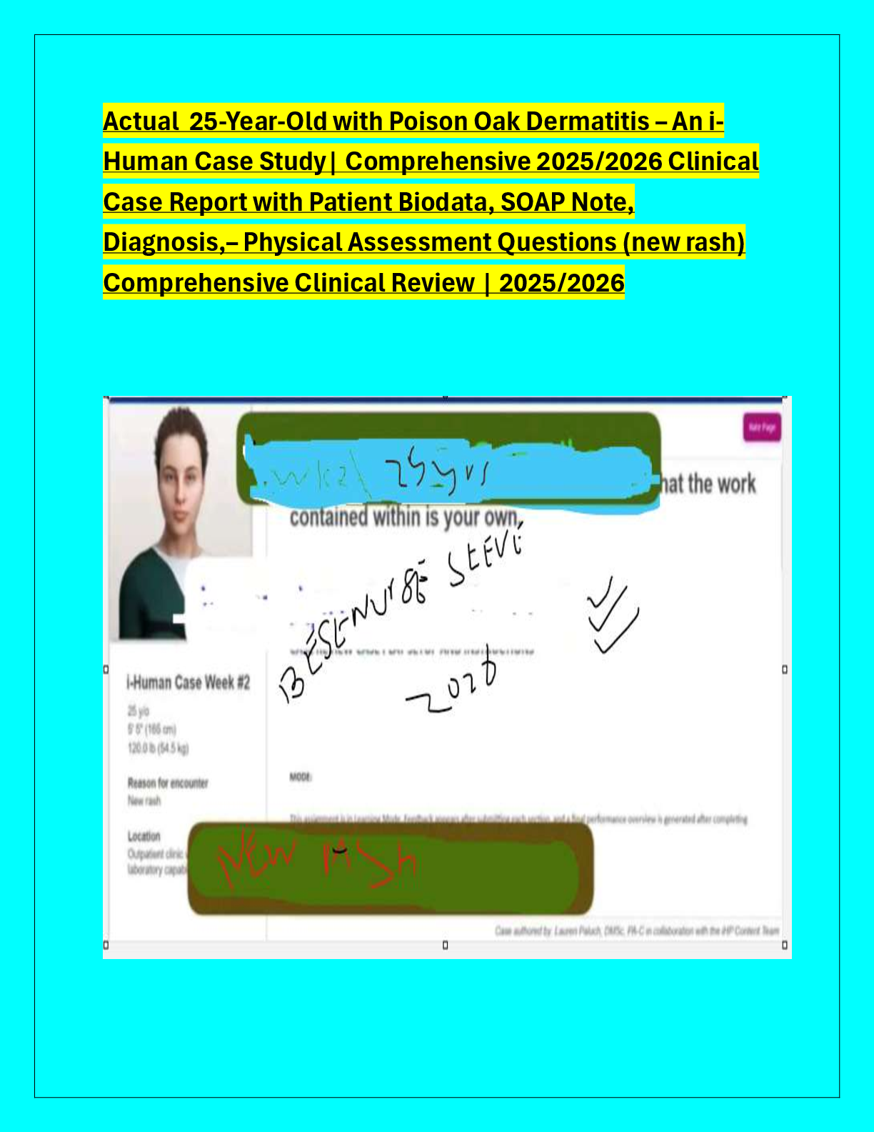 *NURSING > CASE SOLUTIONS > Actual 25-Year-Old with Poison Oak Dermatitis – An i Human Case Study| Comprehensive 2025/2026 Clinical Case Report with Patient Biodata, SOAP Note, Diagnosis,– Physical Assessment Questions (new rash) Comprehensive Clinical Review | 2025/2026