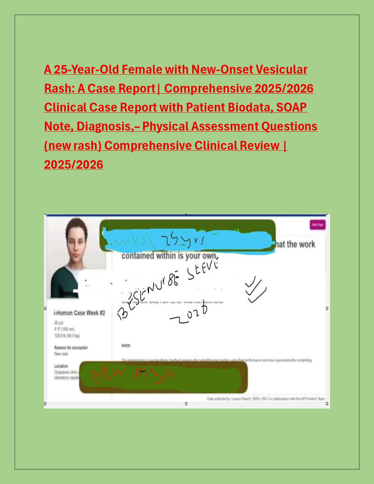 *NURSING > CASE SOLUTIONS > A 25-Year-Old Female with New-Onset Vesicular Rash: A Case Report| Comprehensive 2025/2026 Clinical Case Report with Patient Biodata, SOAP Note, Diagnosis,– Physical Assessment Questions (new rash) Comprehensive Clinical Review | 2025/2026