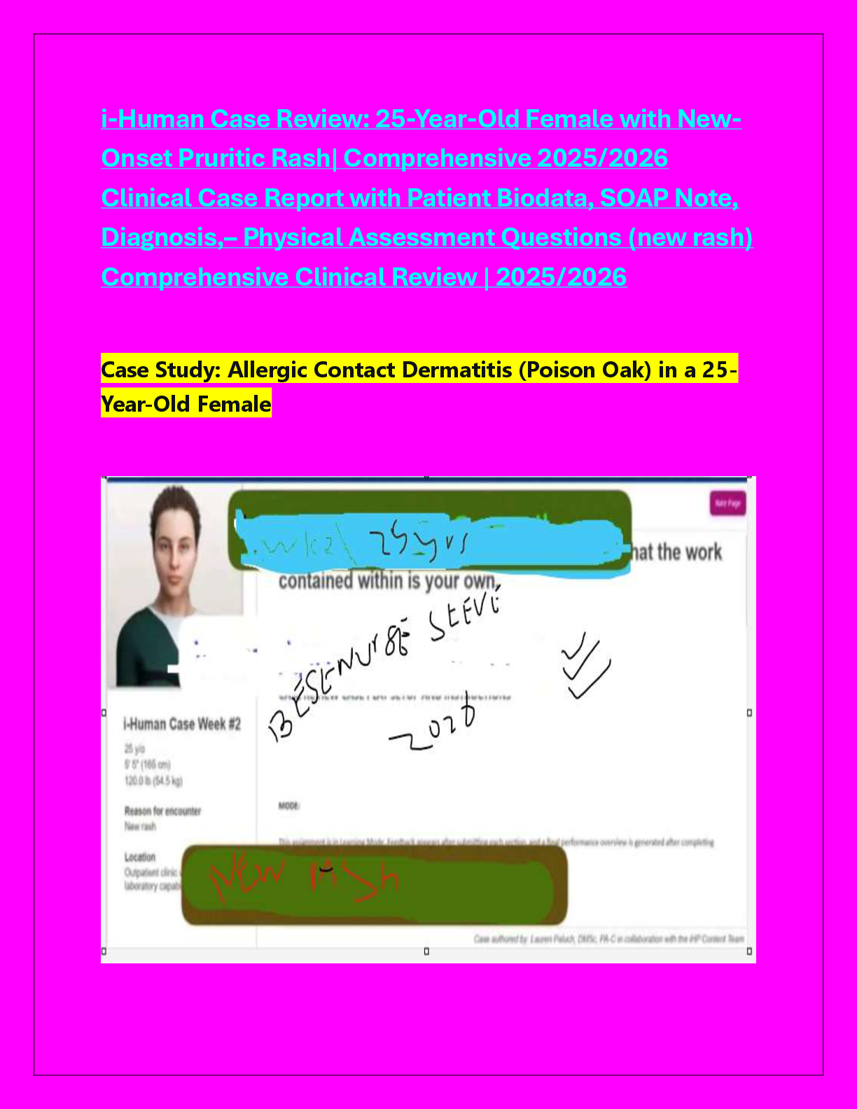 *NURSING > CASE SOLUTIONS > i-Human Case Review: 25-Year-Old Female with New-Onset Pruritic Rash| Comprehensive 2025/2026 Clinical Case Report with Patient Biodata, SOAP Note, Diagnosis,– Physical Assessment Questions (new rash) Comprehensive Clinical Review | 2025/2026 Case Study: Allergic Contact Dermatitis (Poison Oak) in a 25-Year-Old Female