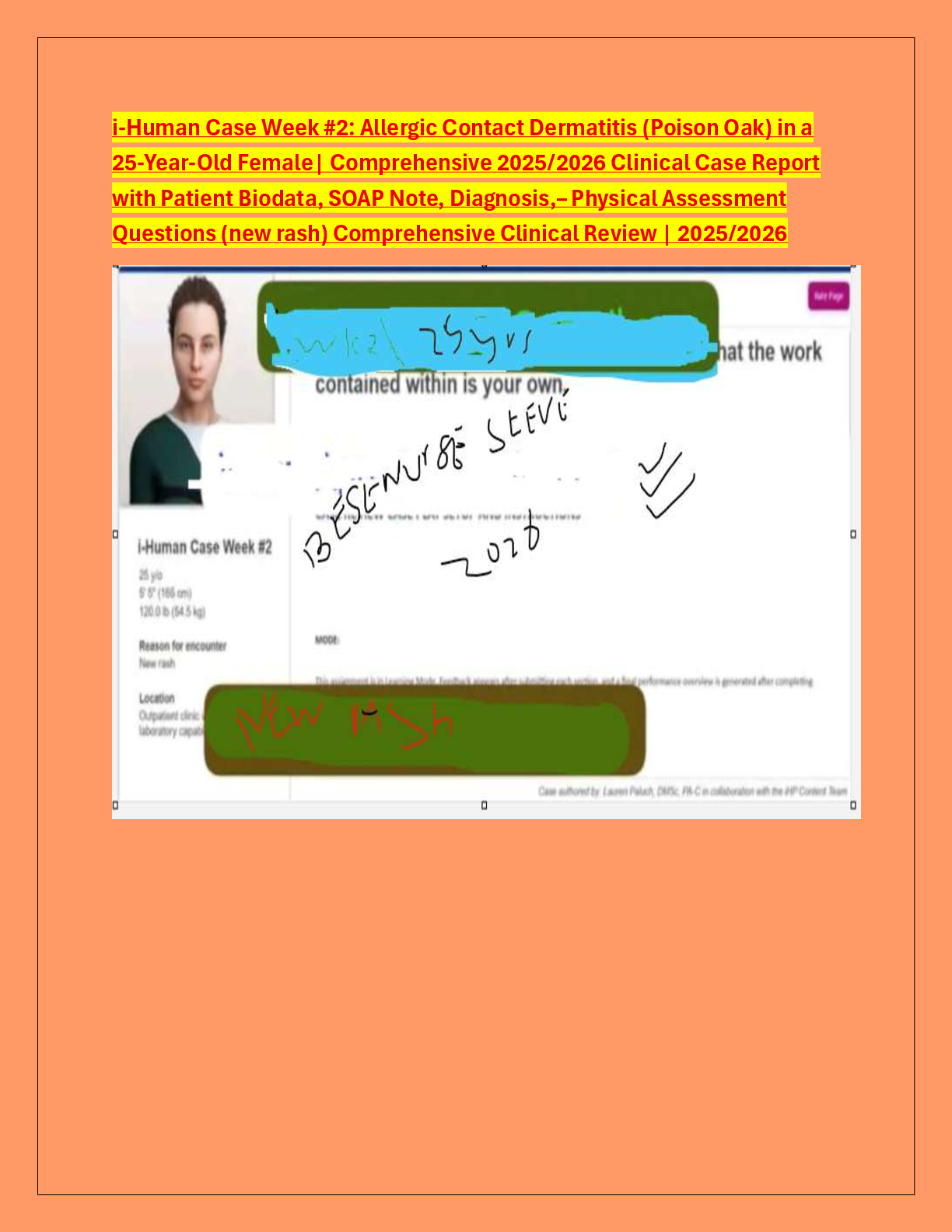 *NURSING > CASE SOLUTIONS > i-Human Case Week #2: Allergic Contact Dermatitis (Poison Oak) in a 25-Year-Old Female| Comprehensive 2025/2026 Clinical Case Report with Patient Biodata, SOAP Note, Diagnosis,– Physical Assessment Questions (new rash) Comprehensive Clinical Review | 2025/2026