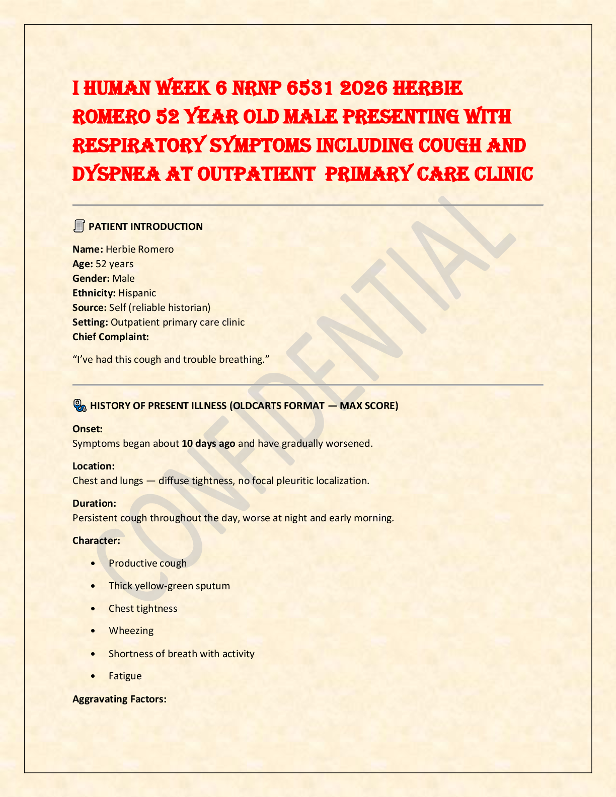 *NURSING > iHuman Case Studies > I HUMAN WEEK 6 NRNP 6531 2026 HERBIE ROMERO 52 YEAR OLD MALE PRESENTING WITH RESPIRATORY SYMPTOMS INCLUDING COUGH AND DYSPNEA AT OUTPATIENT PRIMARY CARE CLINIC