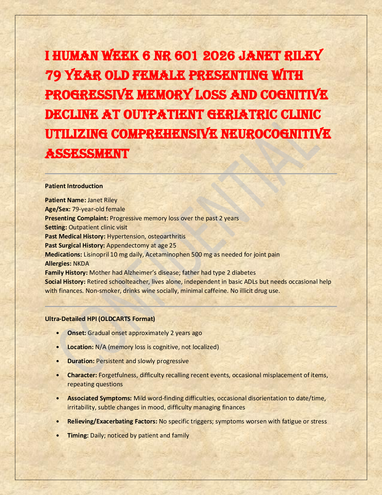 *NURSING > iHuman Case Studies > I HUMAN WEEK 6 NR 601 2026 JANET RILEY 79 YEAR OLD FEMALE PRESENTING WITH PROGRESSIVE MEMORY LOSS AND COGNITIVE DECLINE AT OUTPATIENT GERIATRIC CLINIC UTILIZING COMPREHENSIVE NEUROCOGNITIVE ASSESSMENT