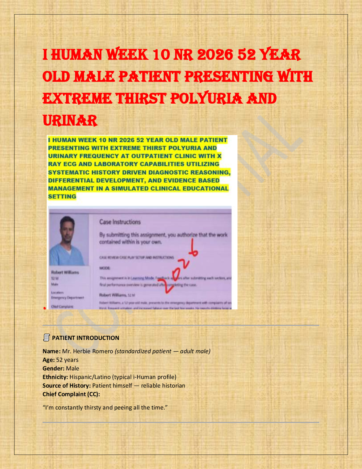 *NURSING > iHuman Case Studies > I HUMAN WEEK 10 NR 2026 52 YEAR OLD MALE PATIENT PRESENTING WITH EXTREME THIRST POLYURIA AND URINAR