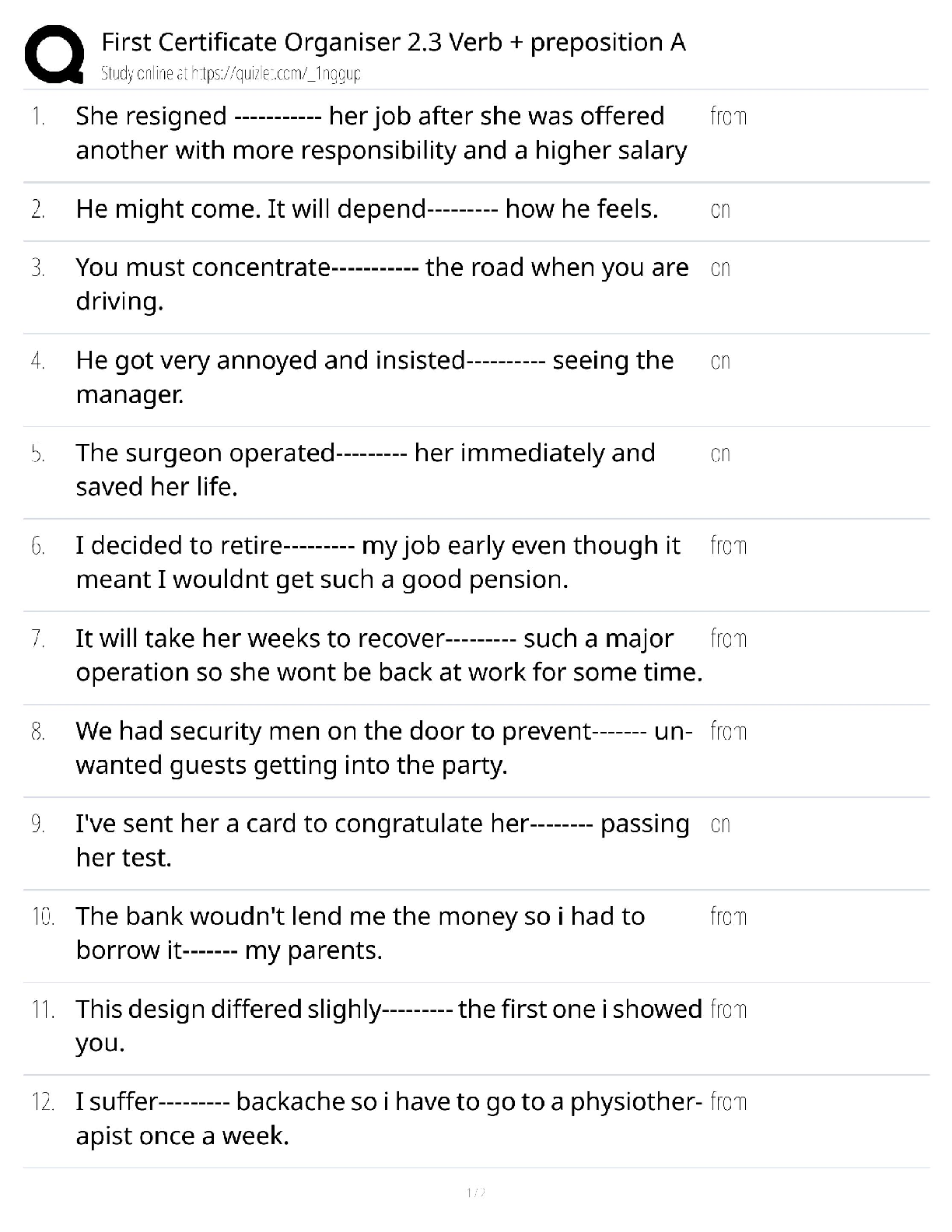 English > QUESTIONS & ANSWERS > First Certificate Organiser 2.3 Test Bank / Verb + Preposition A / 2025 Update / Score 100%