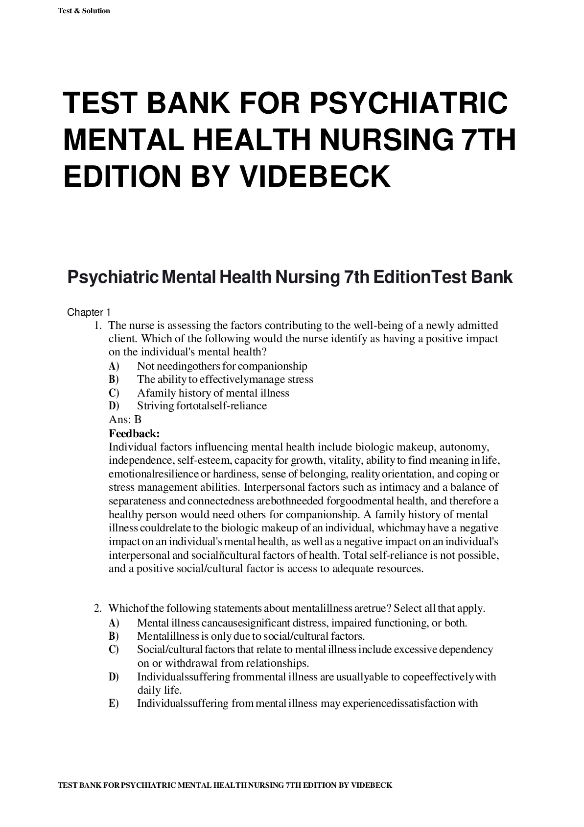 PSYCHIATRIC MENTAL HEALTH NURSING > TEST BANKS > TEST BANK FOR PSYCHIATRIC MENTAL HEALTH NURSING 7TH EDITION BY VIDEBECK