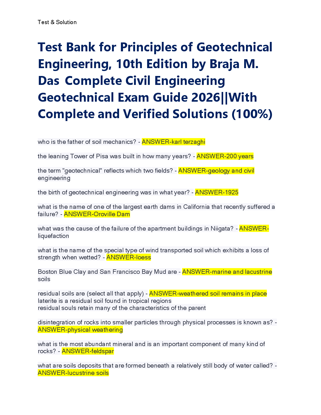 Engineering > TEST BANKS > Test Bank for Principles of Geotechnical Engineering, 10th Edition by Braja M. Das Complete Civil Engineering Geotechnical Exam Guide 2026||With Complete and Verified Solutions (100%)