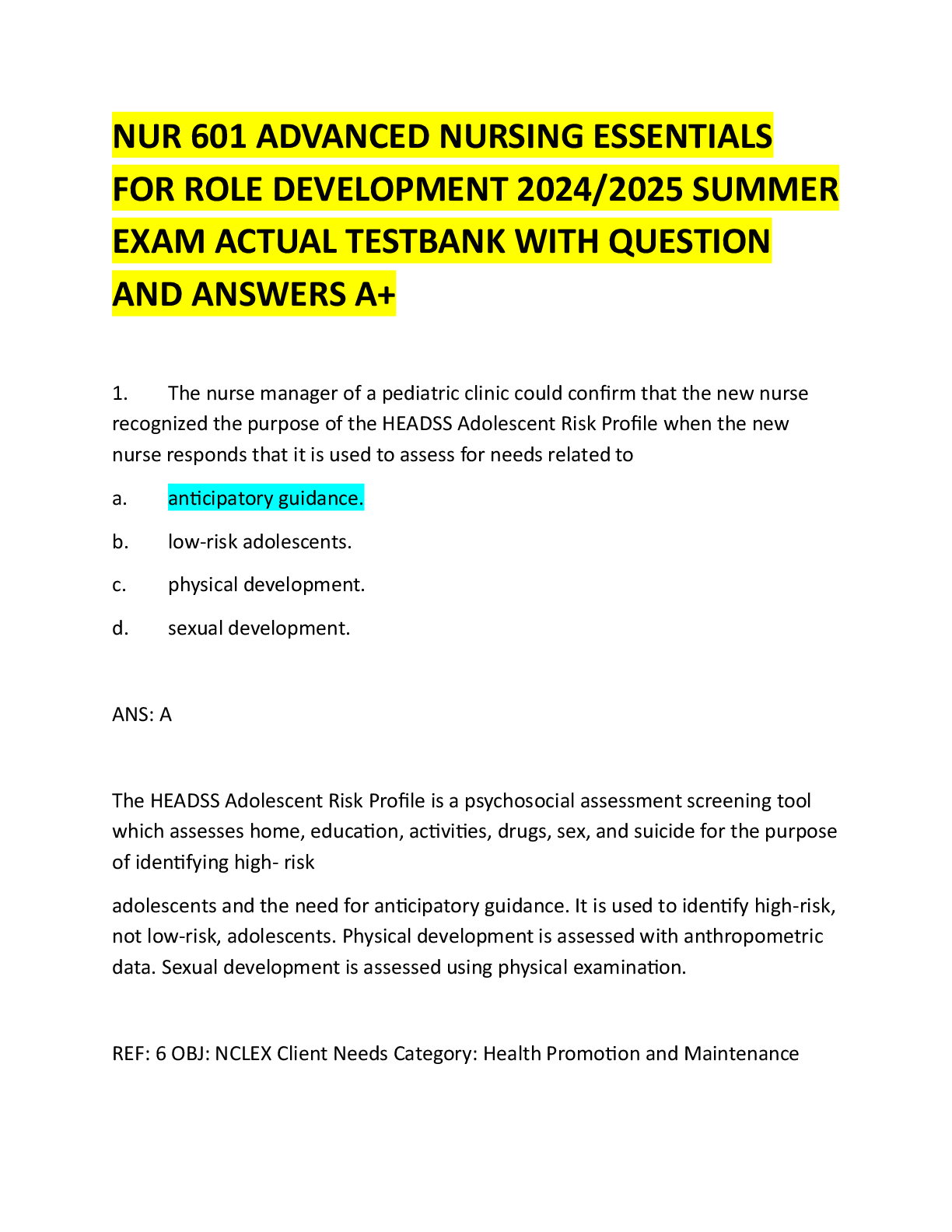 *NURSING > QUESTIONS and ANSWERS > NUR 601 ADVANCED NURSING ESSENTIALS FOR ROLE DEVELOPMENT 2024/2025 SUMMER EXAM ACTUAL TESTBANK WITH QUESTION AND ANSWERS A+