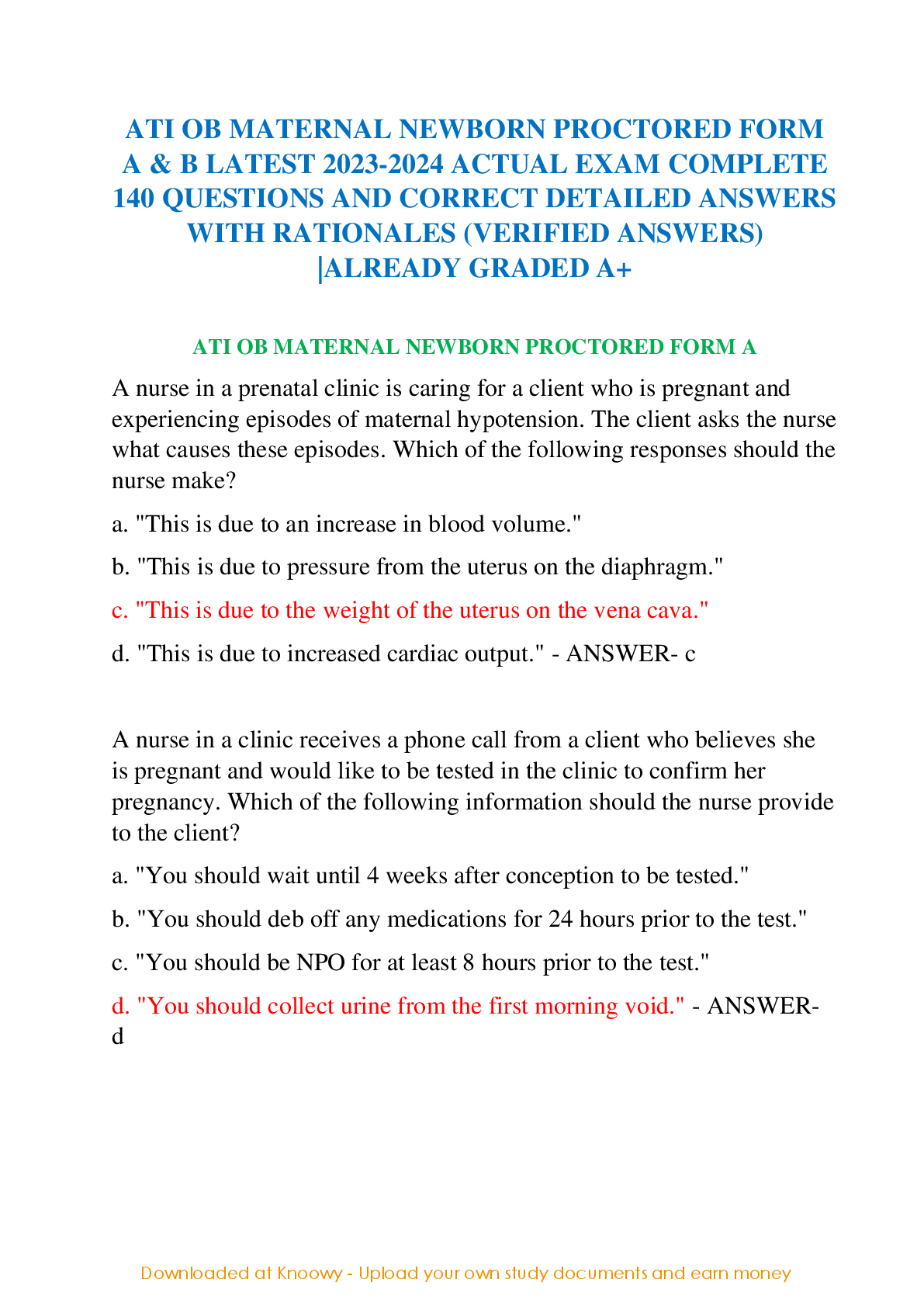 ATI RN MATERNAL NEWBORN PROCTORED > QUESTIONS and ANSWERS > ATI OB MATERNAL NEWBORN PROCTORED FORM A & B LATEST 2023-2024 ACTUAL EXAM COMPLETE 140 QUESTIONS AND CORRECT DETAILED ANSWERS