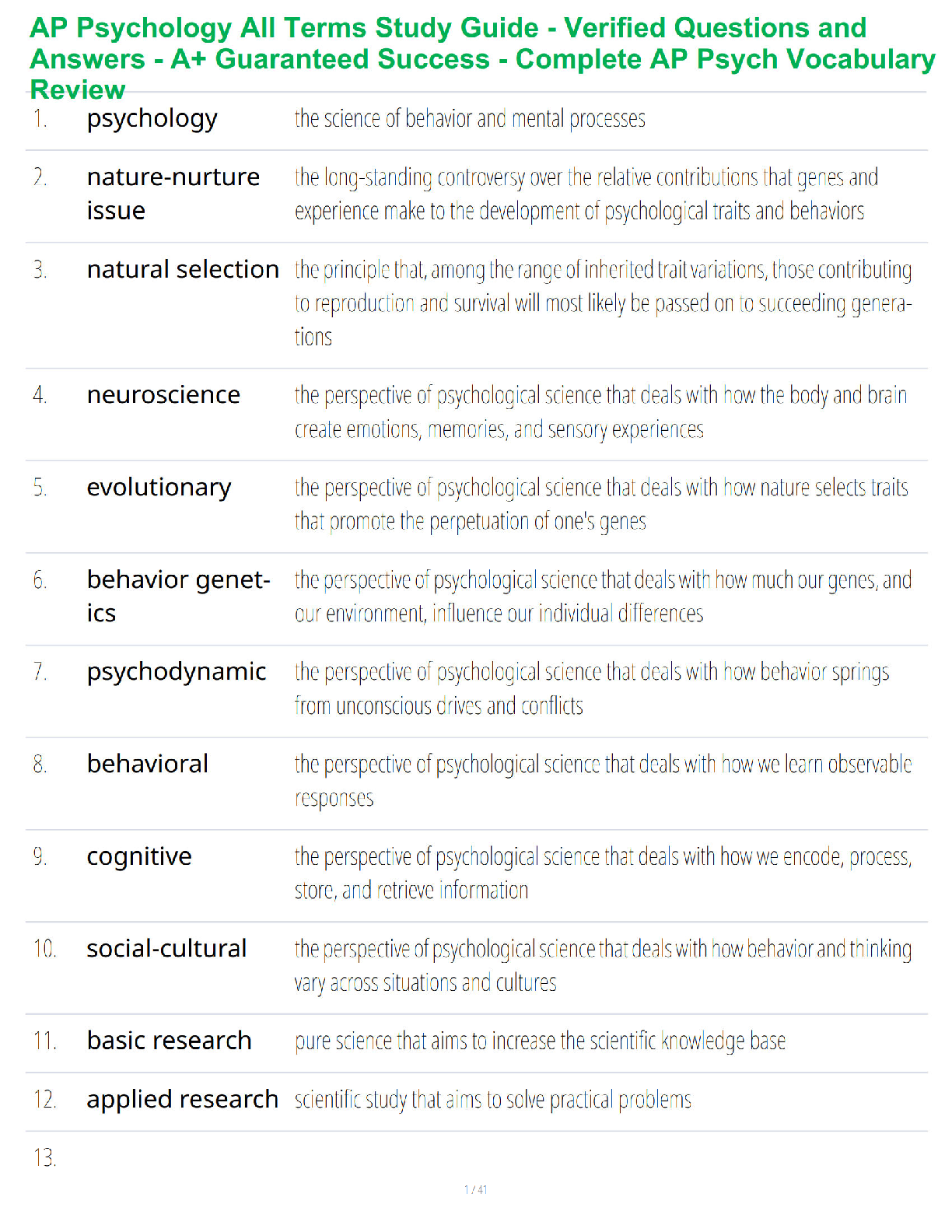 Psychology > STUDY GUIDE > AP Psychology All Terms Study Guide - Verified Questions and Answers - A+ Guaranteed Success - Complete AP Psych Vocabulary Review