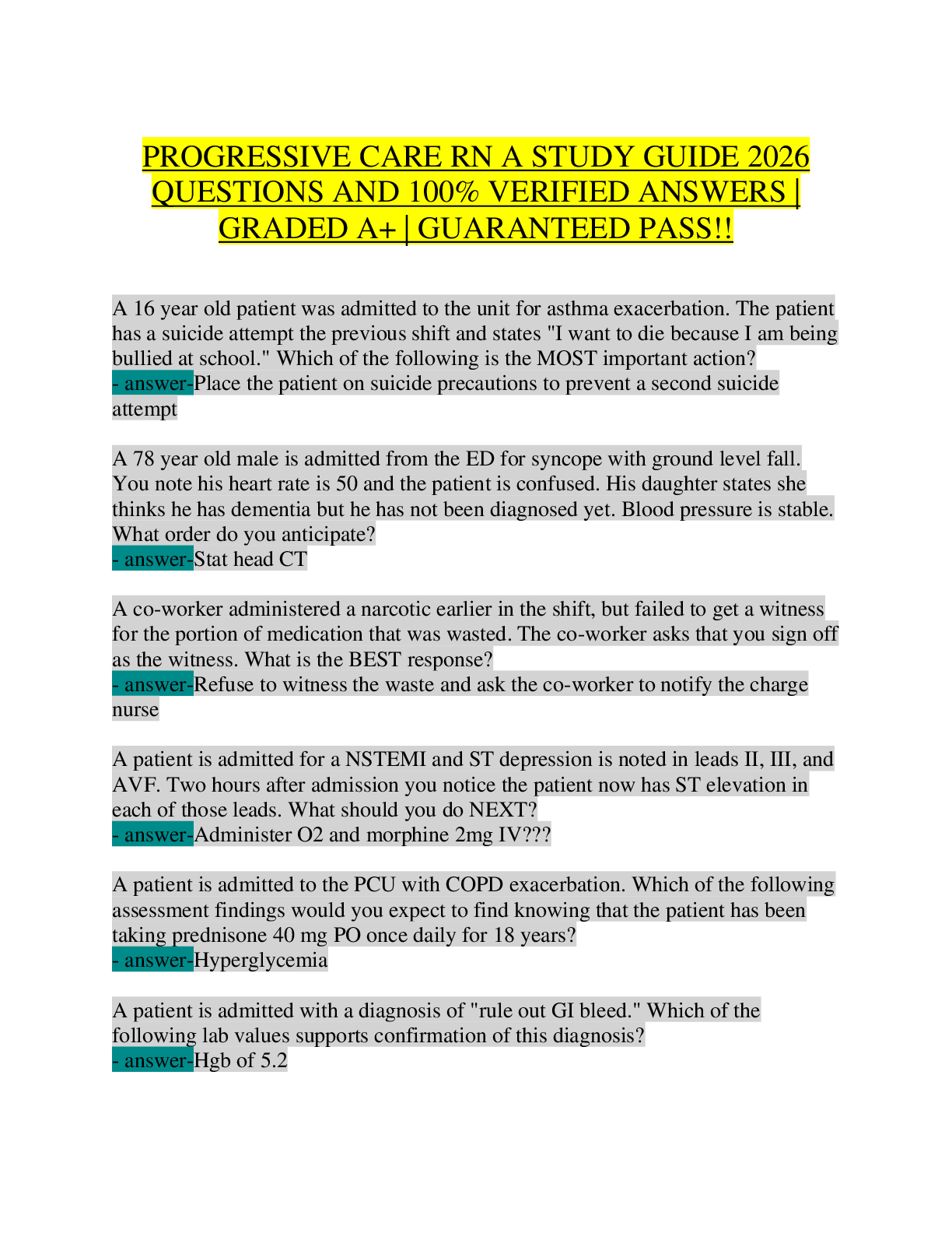 Health Care > EXAM REVIEW > PROGRESSIVE CARE RN A STUDY GUIDE 2026: 70+ Questions and 100% Verified Answers | PCU Nursing | Step-Down | NCLEX-RN