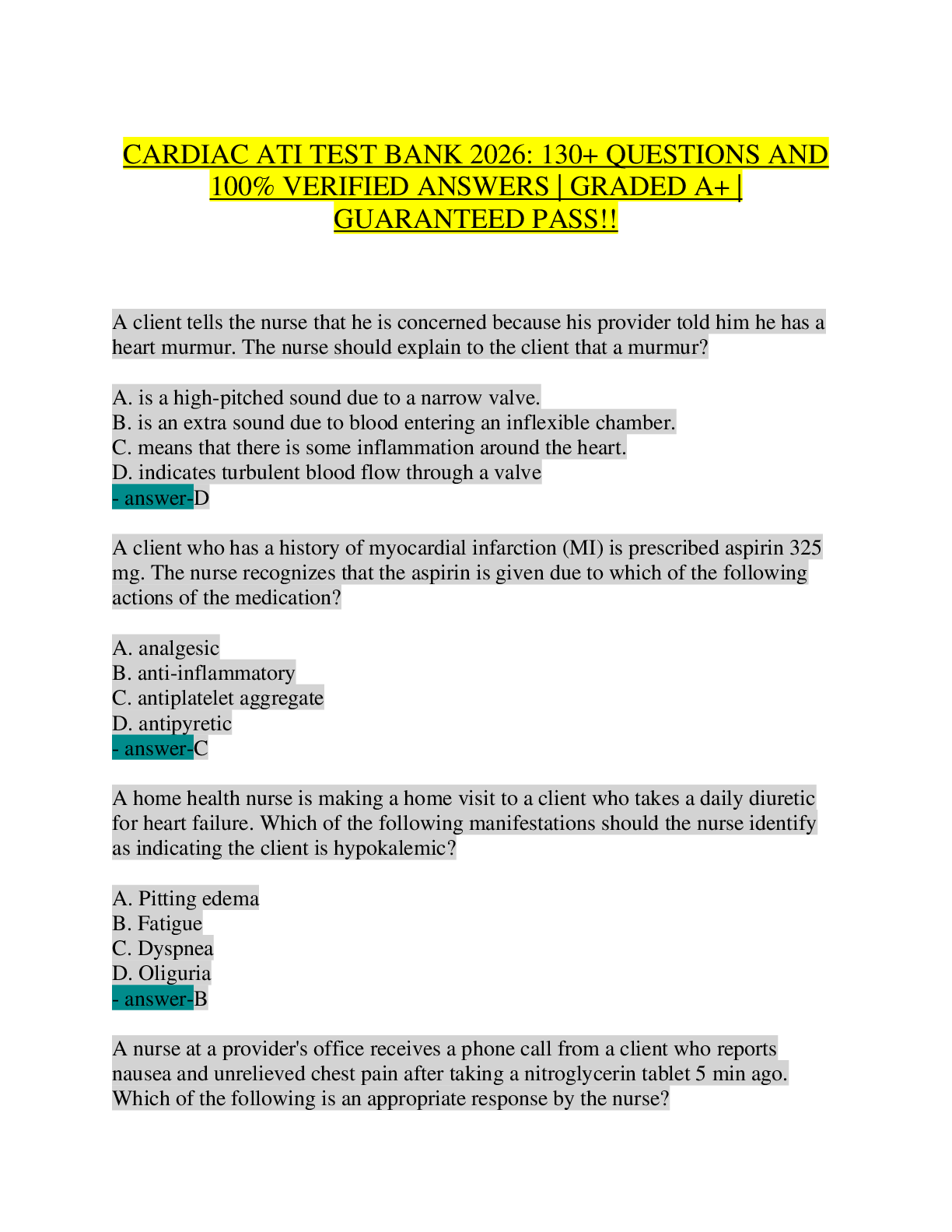 Cardiology > TEST BANKS > CARDIAC ATI TEST BANK 2026: 100+ Questions and 100% Verified Answers | NCLEX-RN Exam Prep | Medical-Surgical Nursing | Graded A+