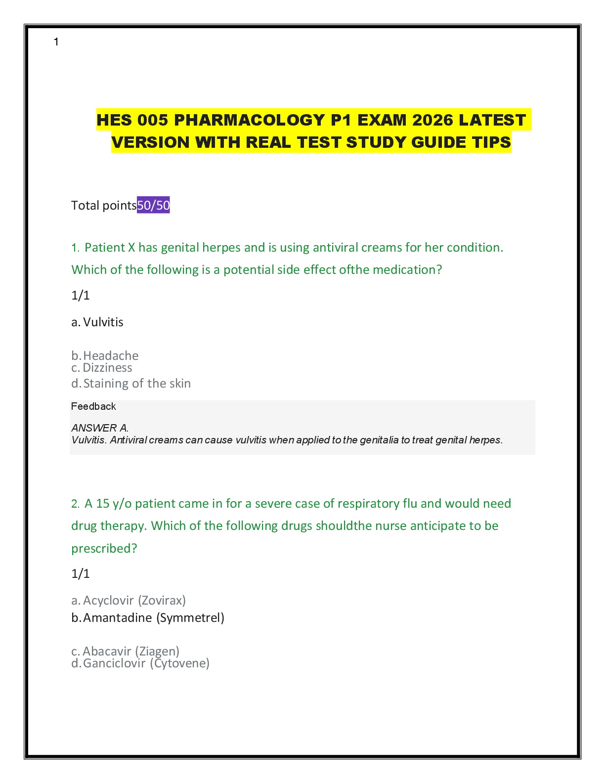 PharmacologyHESI  > HES 005 PHARMACOLOGY P1 EXAM 2026 LATEST VERSION WITH REAL TEST STUDY GUIDE TIPS
