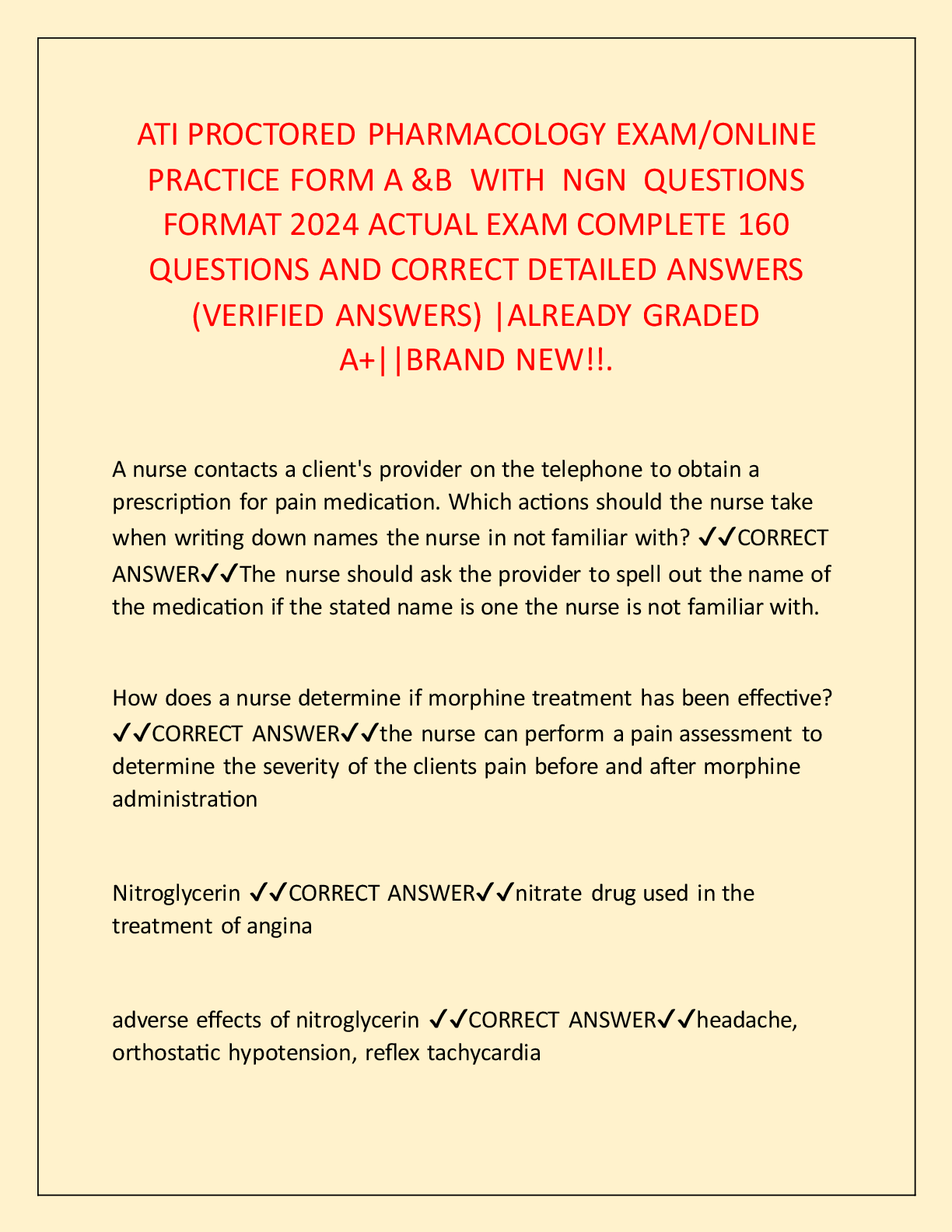 ATI RN PHARMACOLOGY > QUESTIONS and ANSWERS > ATI PROCTORED PHARMACOLOGY EXAM/ONLINE PRACTICE FORM A &B WITH NGN QUESTIONS FORMAT 2024 ACTUAL EXAM COMPLETE 160 QUESTIONS AND CORRECT DETAILED ANSWERS |ALREADY GRADED A+|