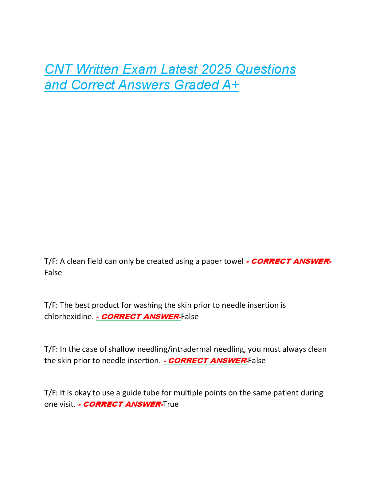 *NURSING > EXAM > CNT Written Exam Latest 2025 Questions and Correct Answers Graded A+