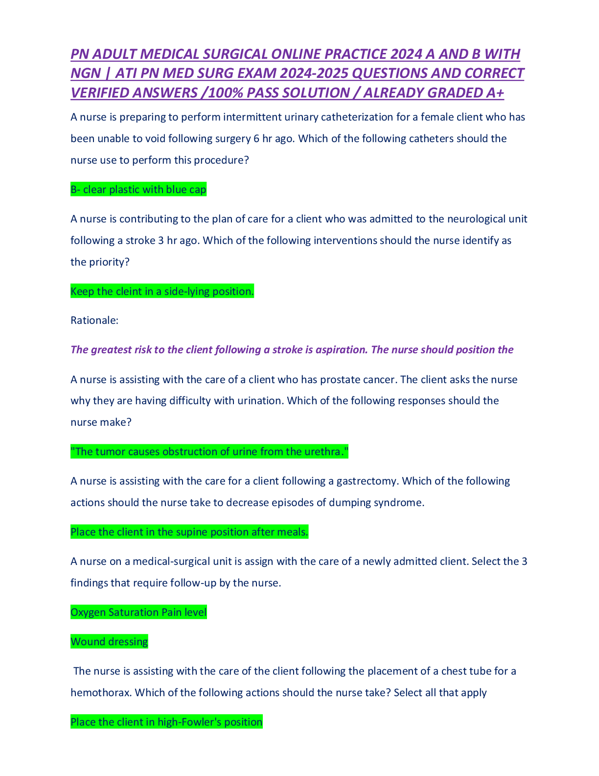 ATI RN MED SURG PROCTORED EXAM 2023 LATEST EXAM > QUESTIONS and ANSWERS > PN ADULT MEDICAL SURGICAL ONLINE PRACTICE 2024 A AND B WITH NGN | ATI PN MED SURG EXAM 2024-2025 QUESTIONS AND CORRECT VERIFIED ANSWERS /100% score GRADED A+