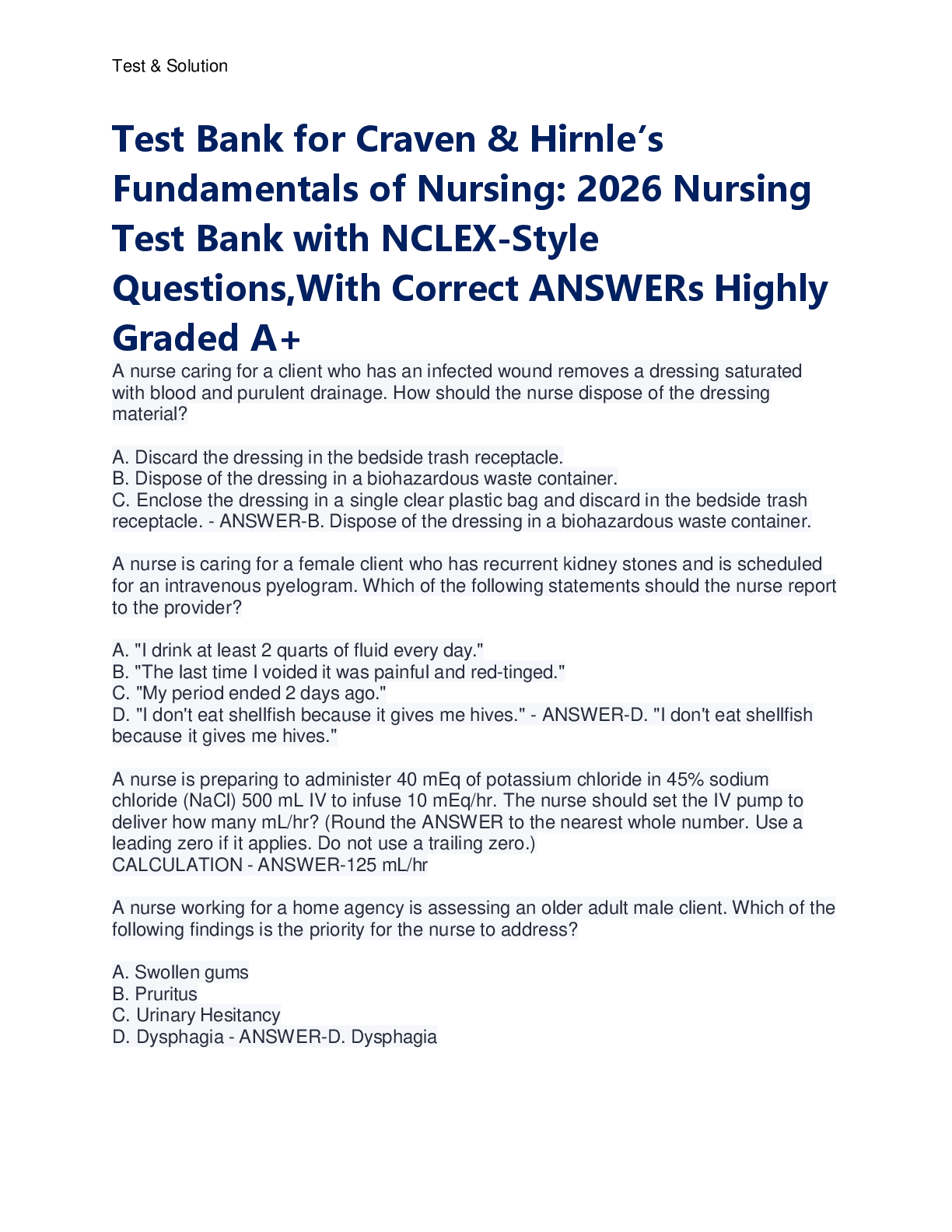 Canadian Fundamentals of Nursing > TEST BANKS > Test Bank for Craven & Hirnle’s Fundamentals of Nursing: 2026 Nursing Test Bank with NCLEX-Style Questions,With Correct ANSWERs Highly Graded A+