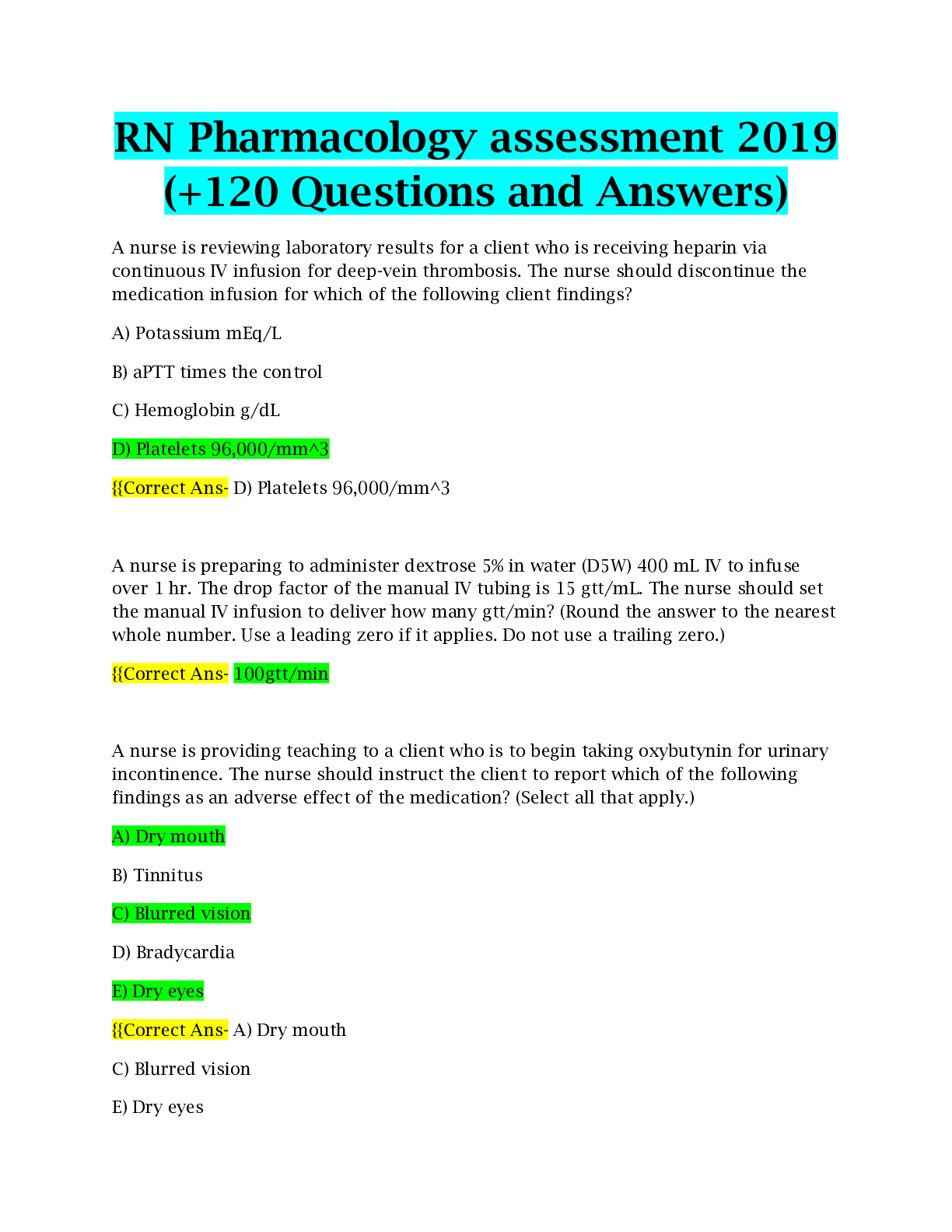 Pharmacology > EXAM > RN Pharmacology assessment 2019 (+120 Questions and Answers)| Definite A+ Score Guide