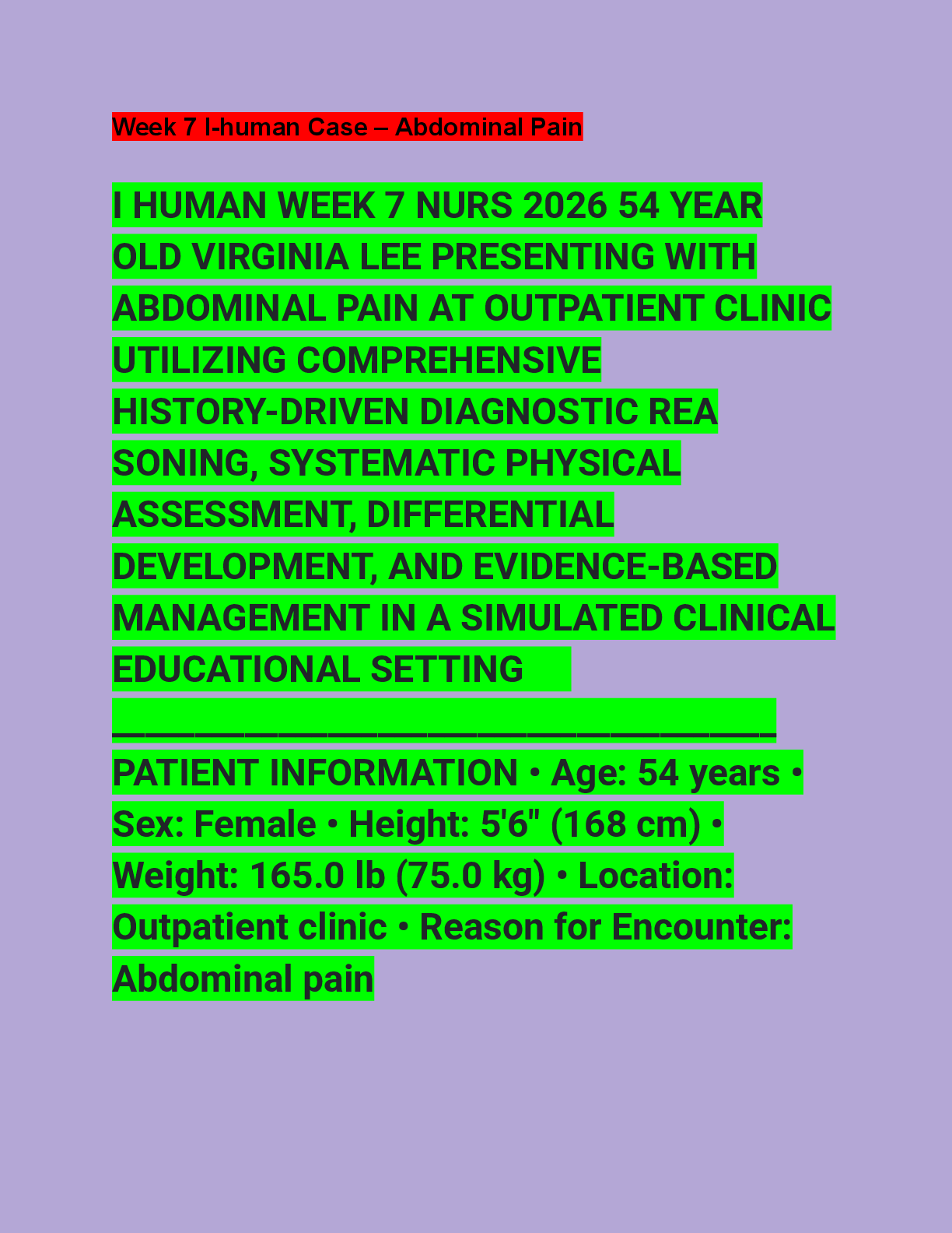 *NURSING > EXAM > I HUMAN WEEK 7 NURS 2026 54 YEAR OLD VIRGINIA LEE PRESENTING WITH ABDOMINAL PAIN AT OUTPATIENT CLINIC UTILIZING COMPREHENSIVE HISTORY-DRIVEN DIAGNOSTIC REA SONING, SYSTEMATIC PHYSICAL ASSESSMENT, DIFFERENTIAL DEVELOPMENT, AND EVIDENCE-B