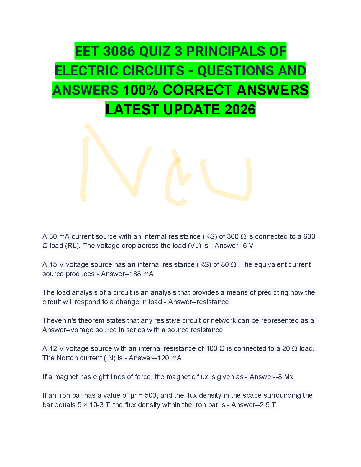 *NURSING > EXAM > EET 3086 QUIZ 3 PRINCIPALS OF ELECTRIC CIRCUITS - QUESTIONS AND ANSWERS 100% CORRECT ANSWERS LATEST UPDATE 2026