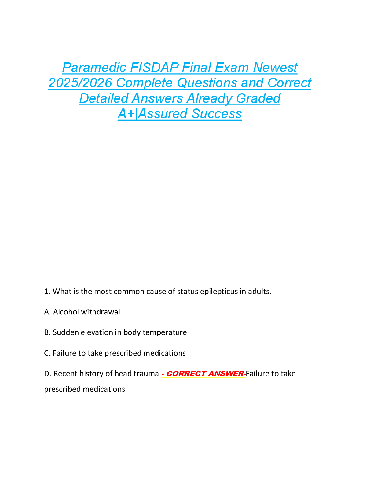 *NURSING > EXAM > Fisdap Paramedic Final Exam Practice Newest 2025/2026 Complete Questions and Correct Detailed Answers Graded A+|Brand New Version