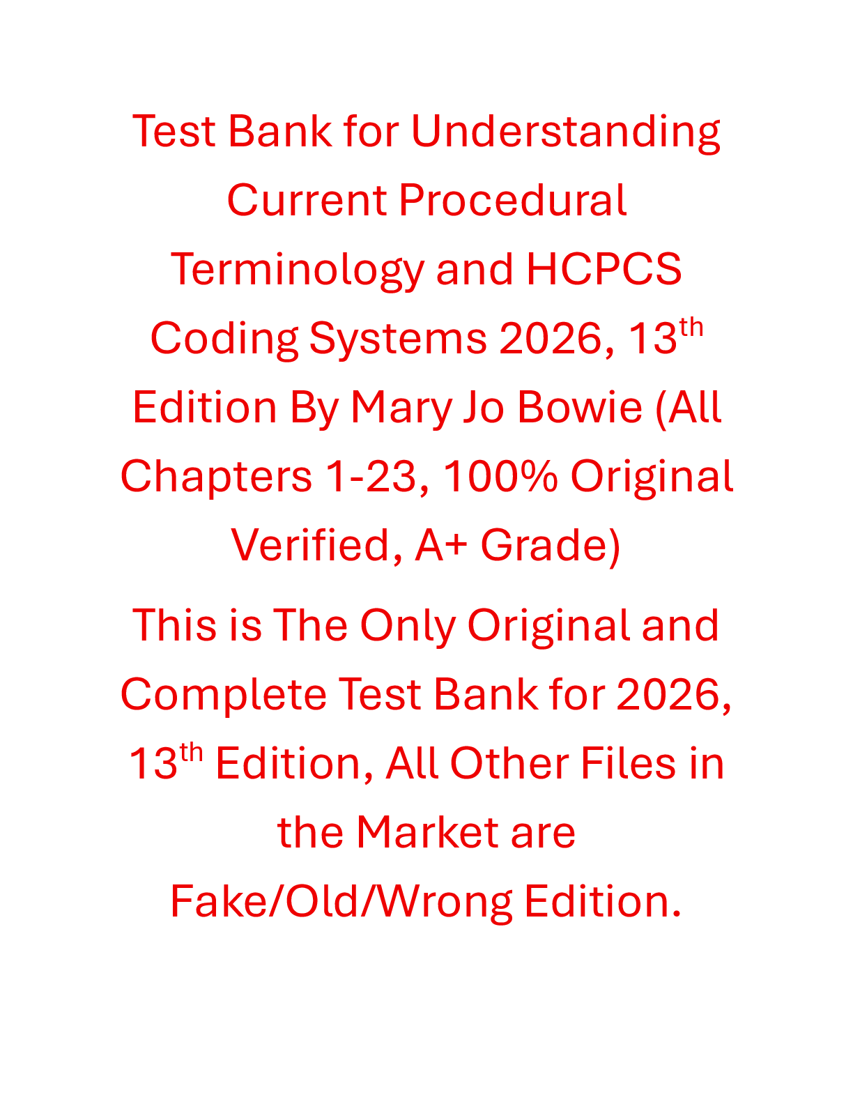 Computer Science > TEST BANKS > Test Bank Understanding Current Procedural Terminology and HCPCS Coding Systems 2026, 13th Edition By Mary Jo Bowie