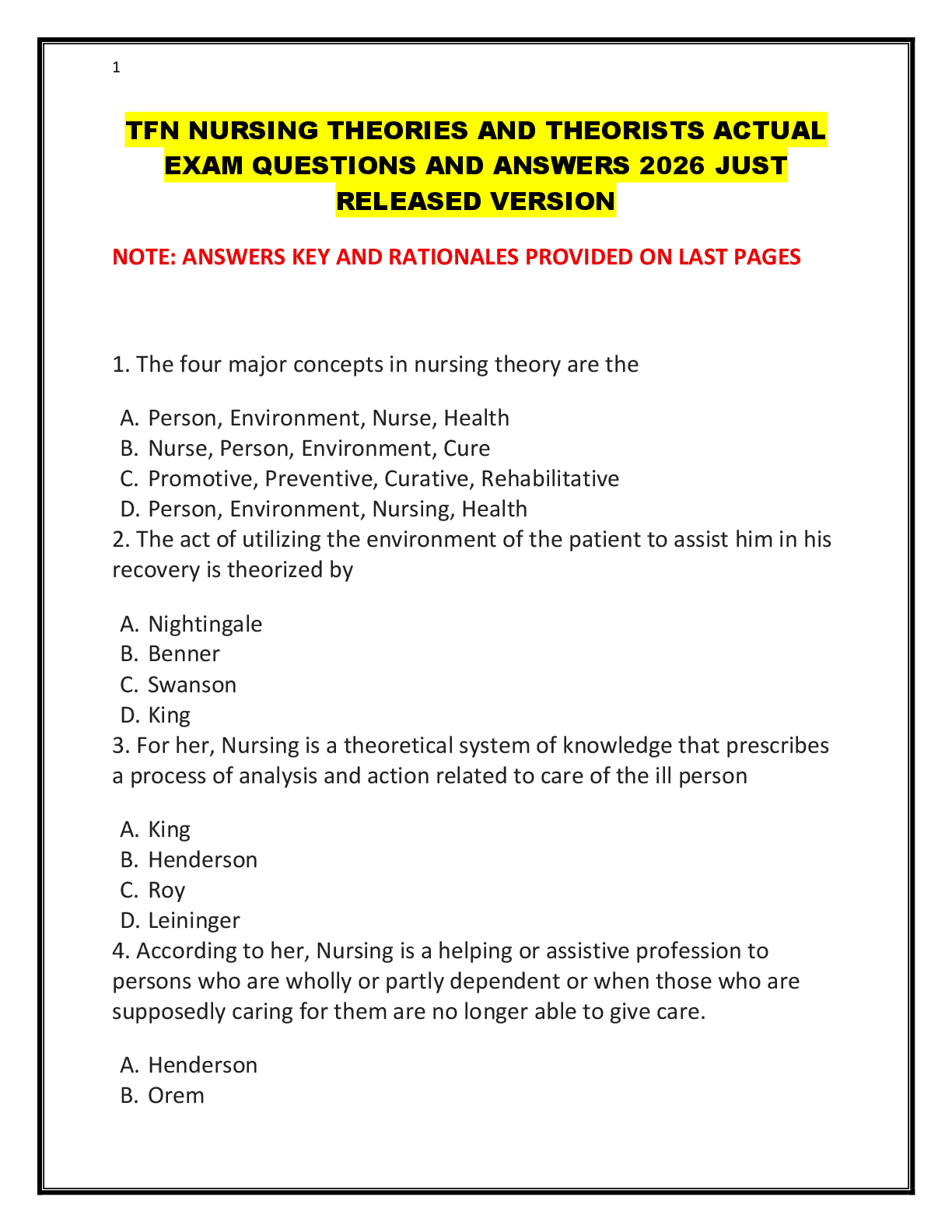 *NURSING > EXAM > TFN NURSING THEORIES AND THEORISTS ACTUAL EXAM QUESTIONS AND ANSWERS 2026 JUST RELEASED VERSION