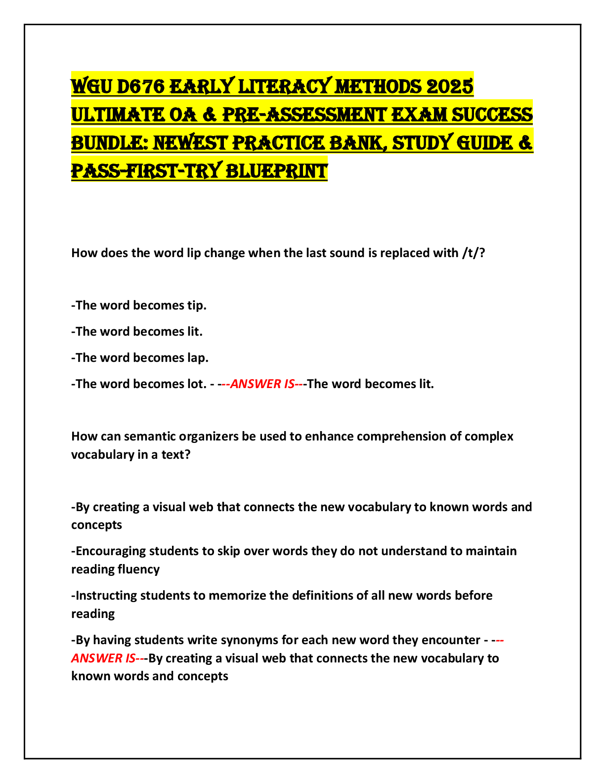 *NURSING > EXAM > WGU D676 Early Literacy Methods 2025 Ultimate OA & Pre-Assessment Exam Success Bundle: Newest Practice Bank, Study Guide & Pass-First-Try Blueprint