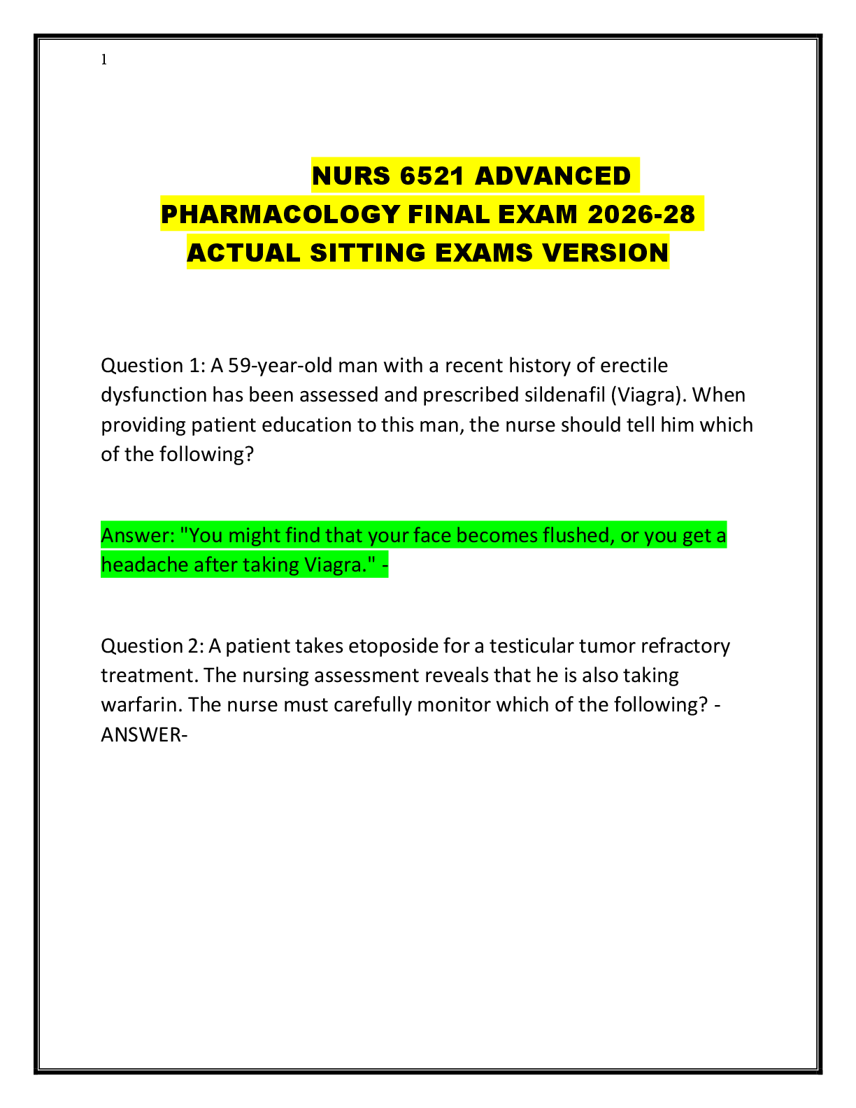 *NURSING > EXAM > NURS 6521 ADVANCED PHARMACOLOGY FINAL EXAM 2026-28 ACTUAL SITTING EXAMS VERSION