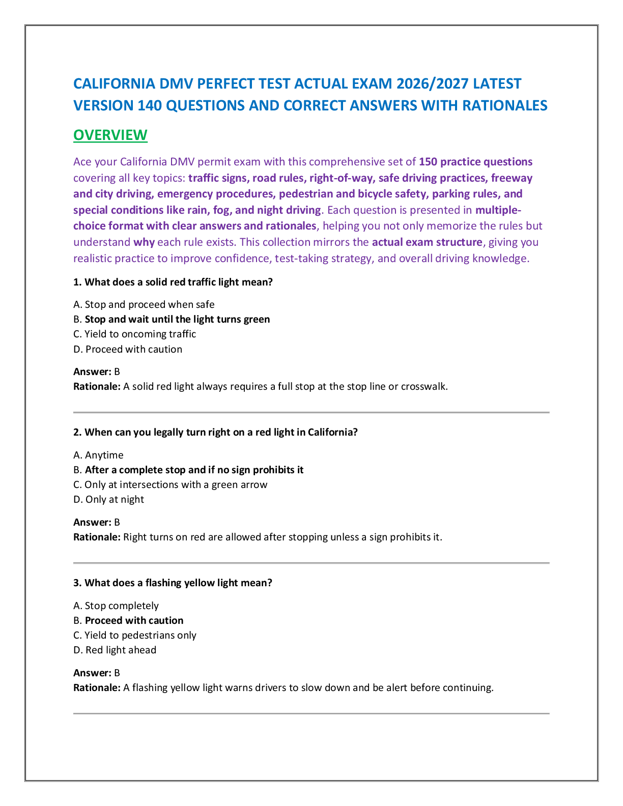 Driving Course > EXAM REVIEW > CALIFORNIA DMV PERFECT TEST ACTUAL EXAM 2026/2027 LATEST VERSION 140 QUESTIONS AND CORRECT ANSWERS WITH RATIONALES
