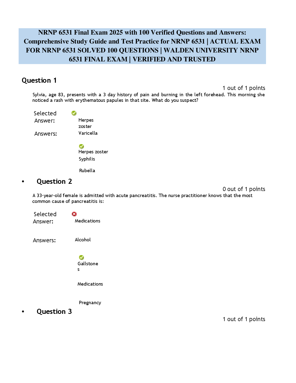 *NURSING > QUESTIONS and ANSWERS > NRNP 6531 Final Exam 2025 with 100 Verified Questions and Answers: Comprehensive Study Guide and Test Practice for NRNP 6531 | ACTUAL EXAM FOR NRNP 6531 SOLVED 100 QUESTIONS |