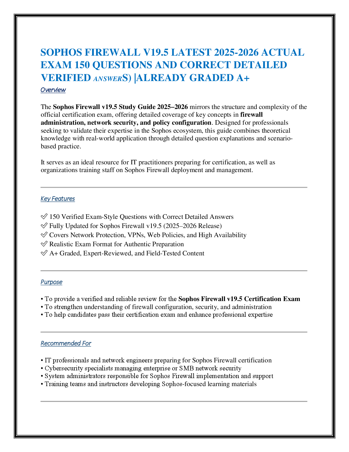 *NURSING > EXAM > SOPHOS FIREWALL V19.5 LATEST 2025-2026 ACTUAL EXAM 150 QUESTIONS AND CORRECT DETAILED VERIFIED ANSWERS) |ALREADY GRADED A+