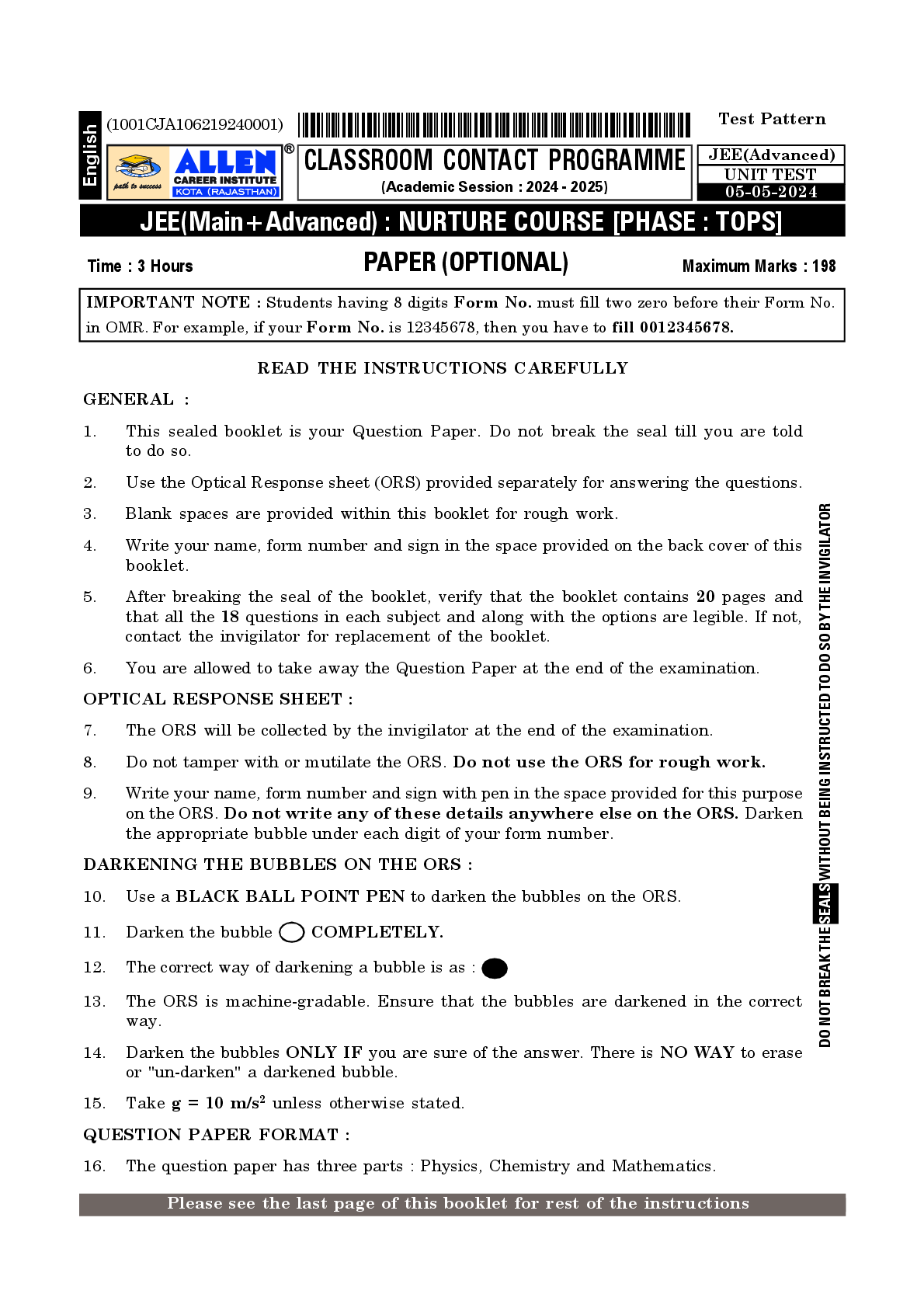 *NURSING > EXAM > JEE(M +A ) : NURTURE COURSE PHASE : TOPS