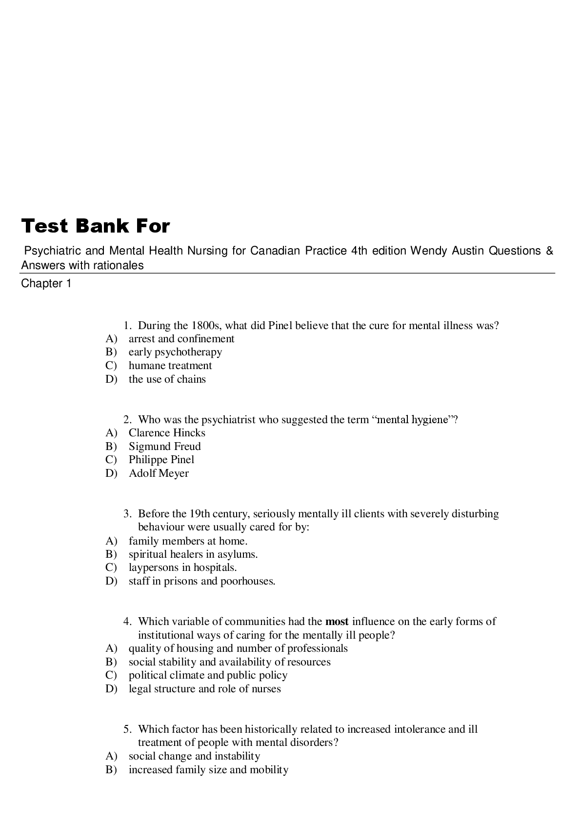 *NURSING > TEST BANKS > Complete Test Bank For Psychiatric and Mental Health Nursing for Canadian Practice (4th Edition) by Wendy Austin Chapters 1–35 Questions & Answers with Rationales”