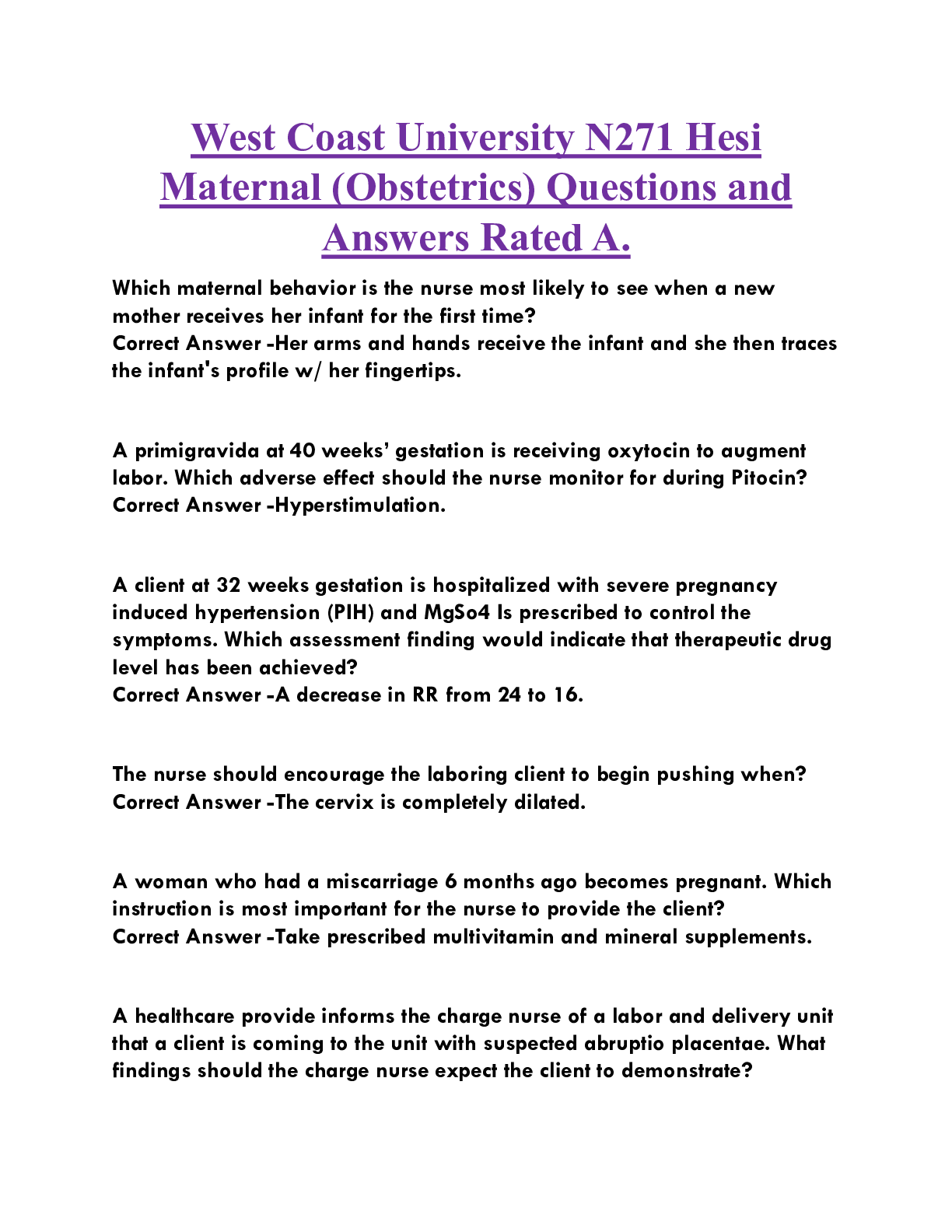 *NURSING > EXAM > West Coast University N271 Hesi Maternal (Obstetrics) Questions and Answers Rated A.