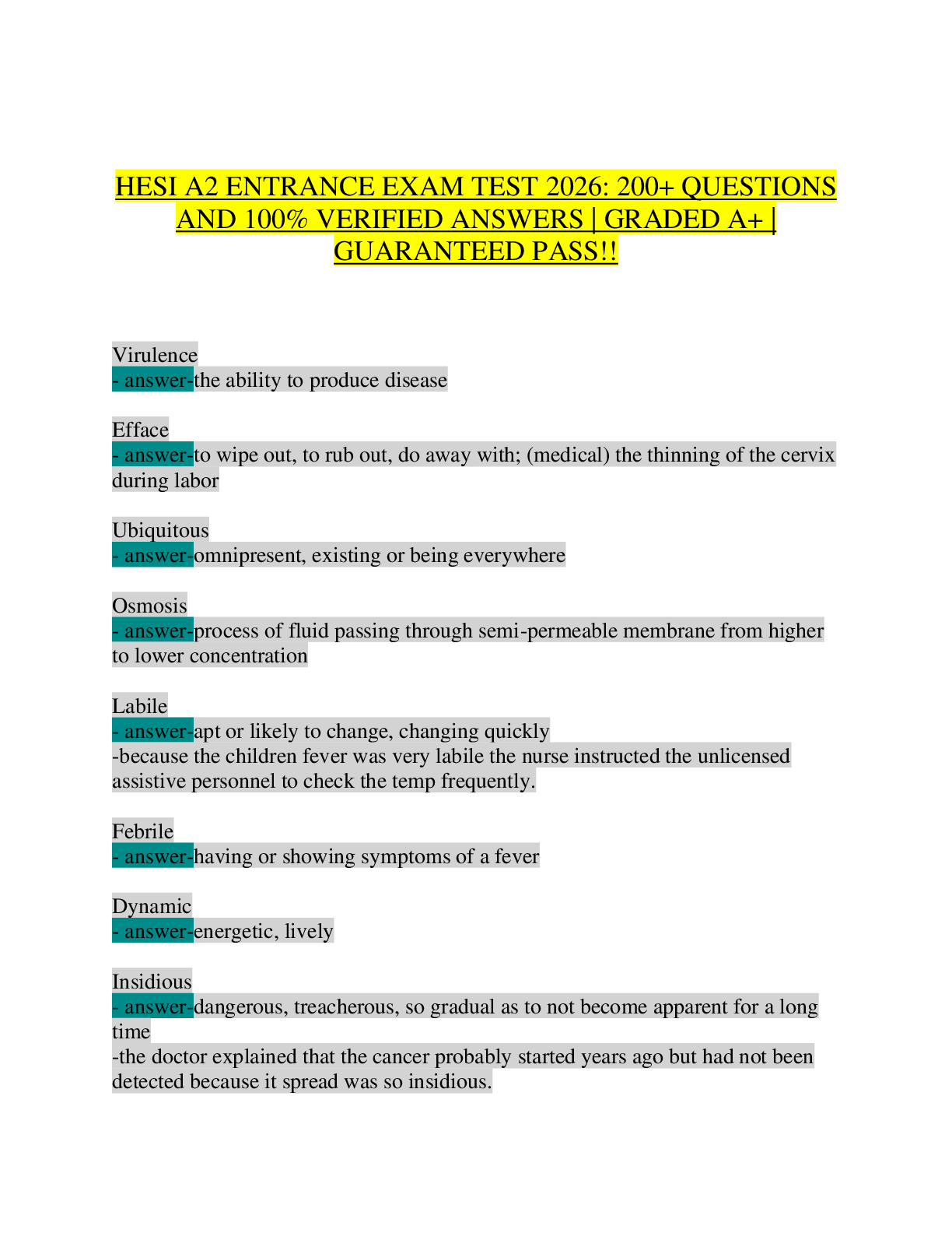 HESI A2 ENTRANCE > STUDY GUIDE > HESI A2 Entrance Exam 2026: Complete Practice Test with 200+ Verified Q&A for Nursing School Admission (Grammar, Vocabulary, Math, Biology & Anatomy)