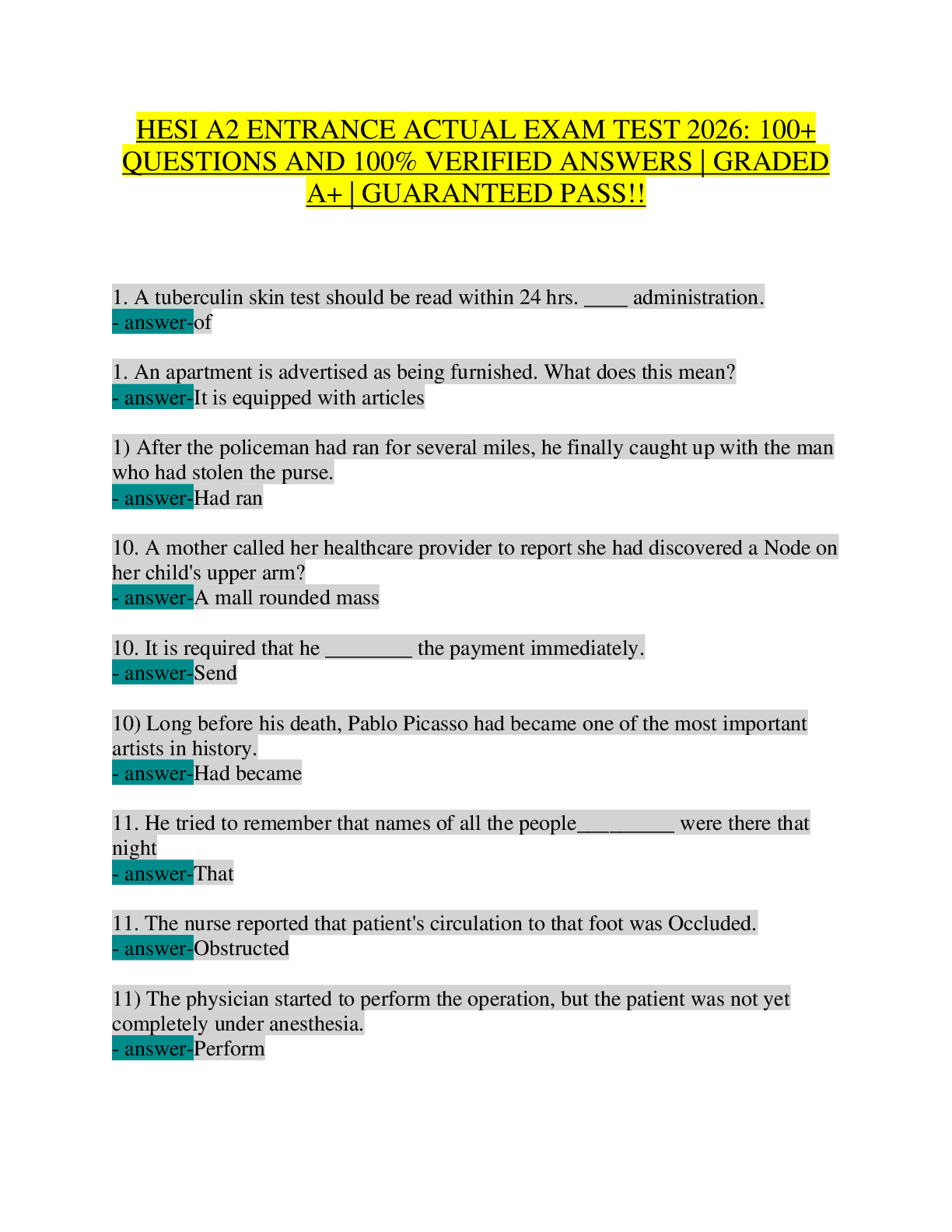 HESI A2 ENTRANCE > STUDY GUIDE > HESI A2 Entrance Exam 2026: Actual Grammar, Vocabulary & Reading Comprehension Test | 50+ Verified Q&A for Nursing School Admission (English Language Arts Section
