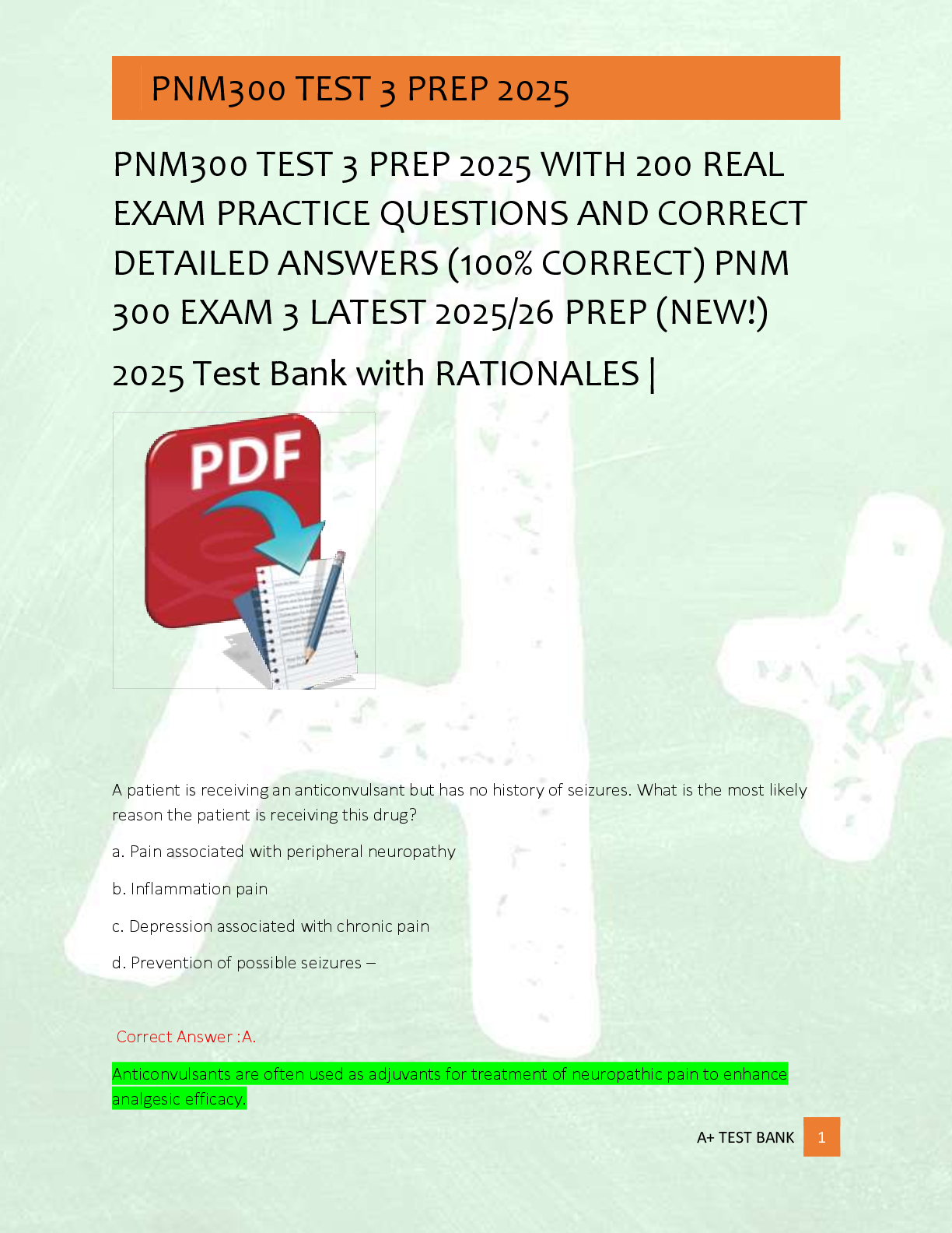 *NURSING > EXAM > PNM300 EXAM PREP 2025 WITH 200 REAL EXAM 1 PRACTICE QUESTIONS AND CORRECT DETAILED ANSWERS (100% CORRECT) PNM 300 EXAM 3 LATEST 2025/26 PREP (NEW!) 2025 Test Bank with RATIONALES |