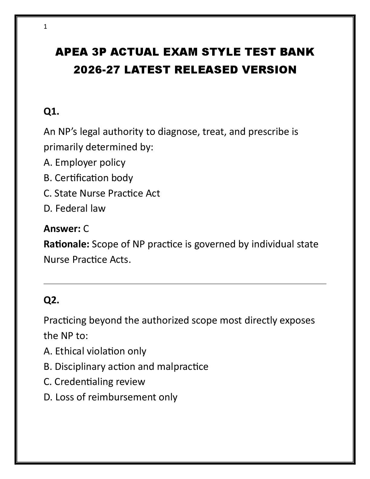 APEA > APEA CERTIFICATION > APEA 3P ACTUAL EXAM STYLE TEST BANK 2026-27 LATEST RELEASED VERSION