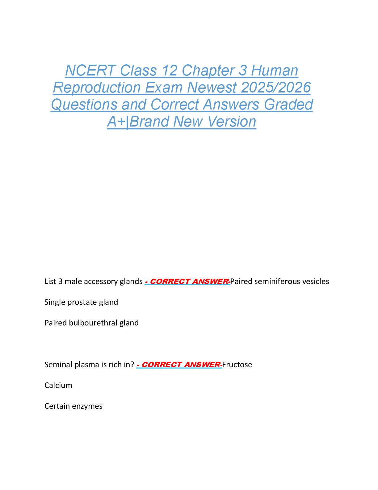 *NURSING > EXAM > NCERT Class 12 Chapter 3 Human Reproduction Exam Newest 2025/2026 Questions and Correct Answers Graded A+|Brand New Version