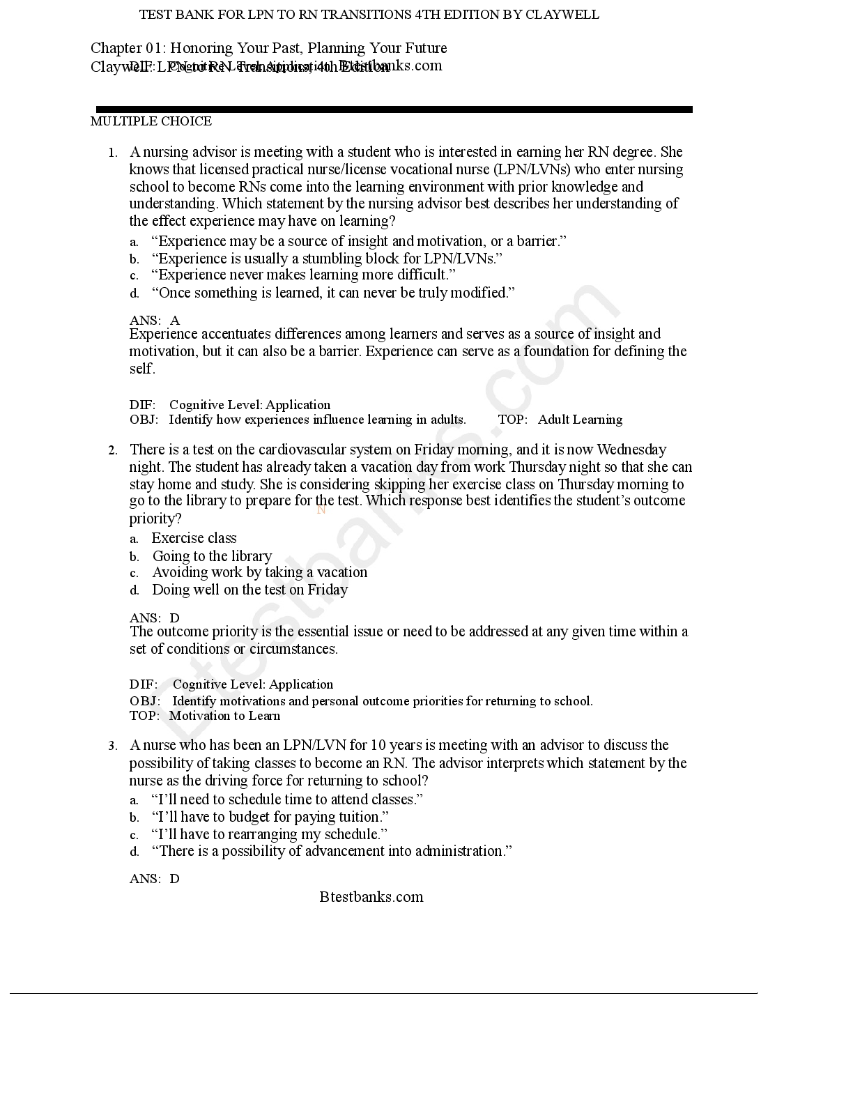 Education > TEST BANKS > TEST BANK LPN to RN Transitions 4th Edition Claywell