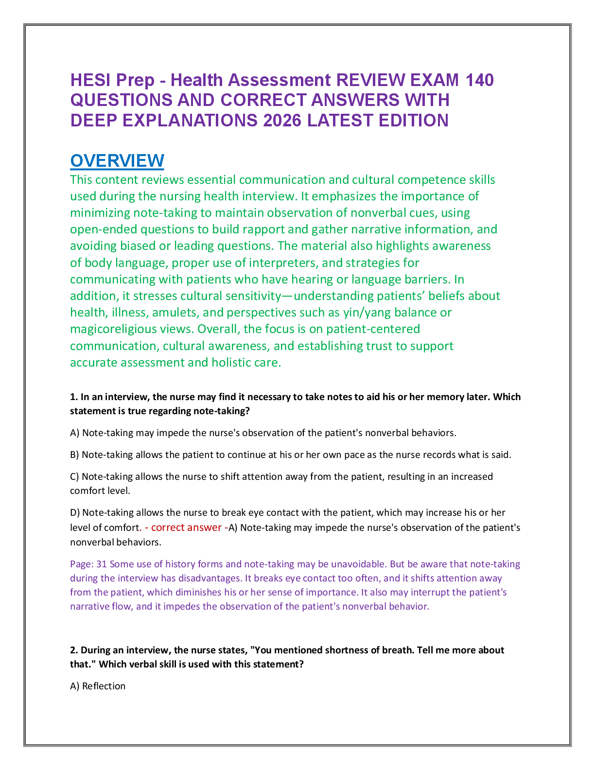 HESI > EXAM REVIEW > HESI Prep - Health Assessment REVIEW EXAM 140 QUESTIONS AND CORRECT ANSWERS WITH DEEP EXPLANATIONS 2026 LATEST EDITION