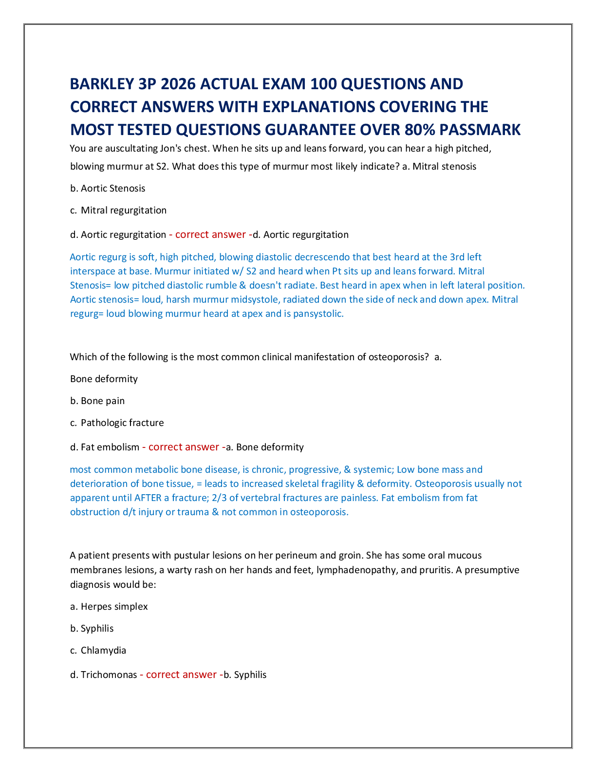 *NURSING > EXAM > BARKLEY 3P ACTUAL EXAM 2026 LATEST VERSION 100 QUESTIONS AND CORRECT ANSWERS WITH EXPLANATIONS COVERING THE MOST TESTED QUESTIONS GUARANTEE OVER 80% PASSMARK