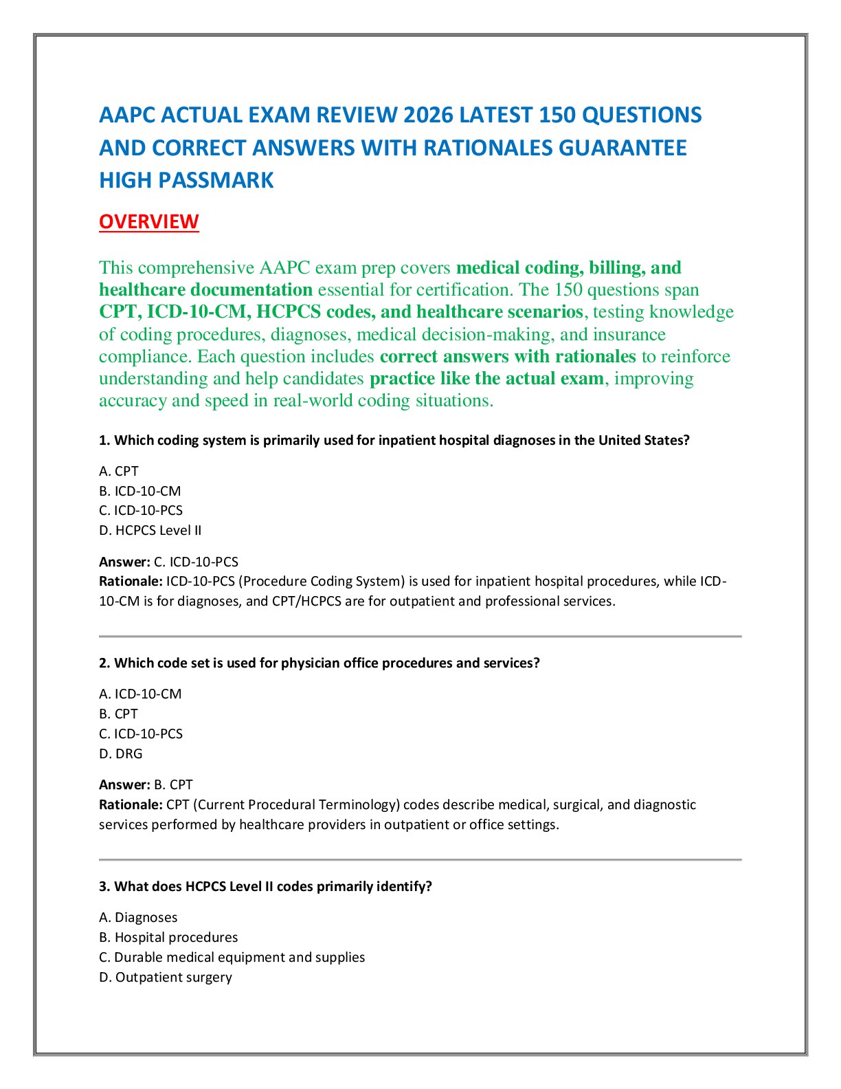*NURSING > EXAM REVIEW > AAPC ACTUAL EXAM REVIEW 2026 LATEST 150 QUESTIONS AND CORRECT ANSWERS WITH RATIONALES GUARANTEE HIGH PASSMARK