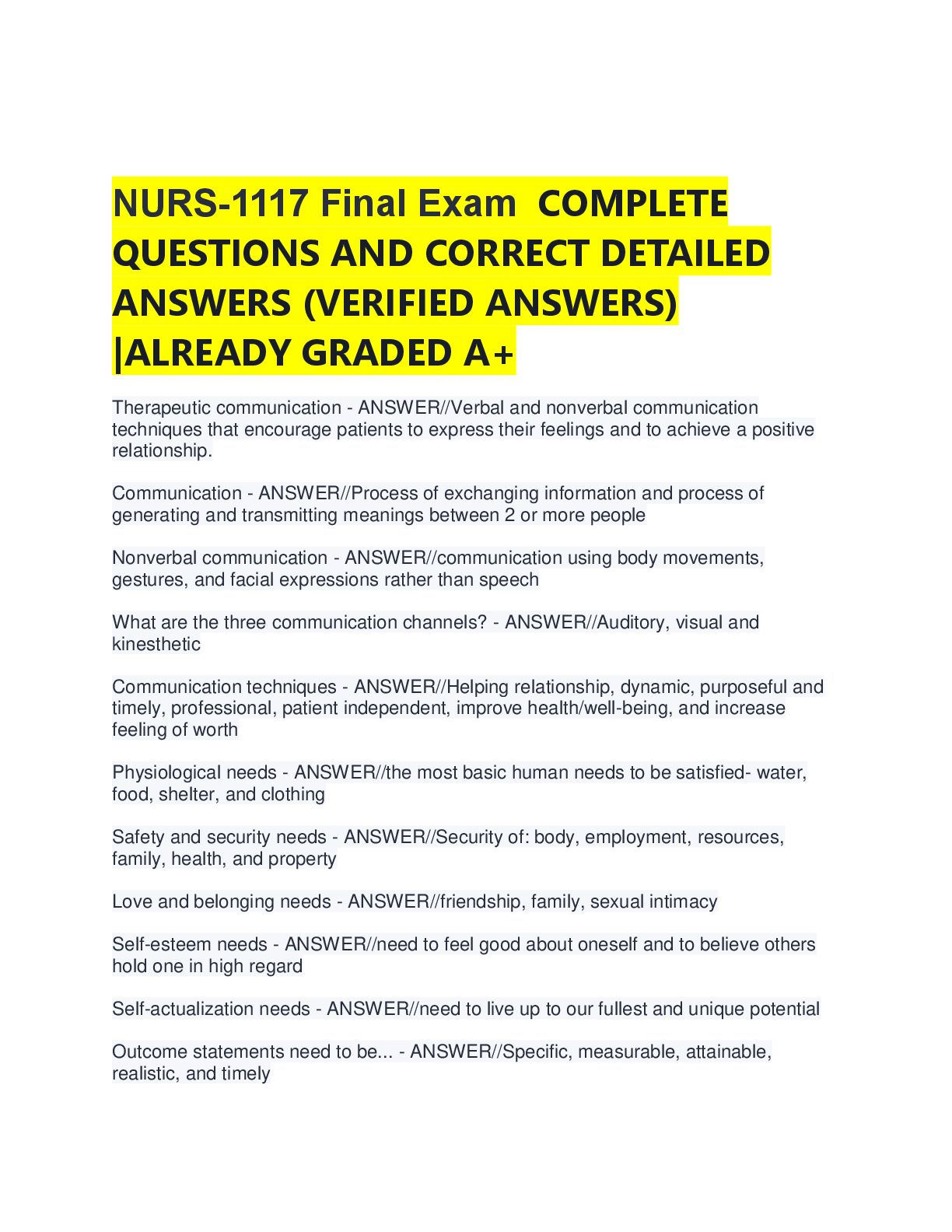 *NURSING > A-Level Question Paper > NURS-1117 Final Exam Complete Questions and Correct Detailed Answers (Verified Answers) Already Graded A+ | Fundamentals of Nursing Study Guide