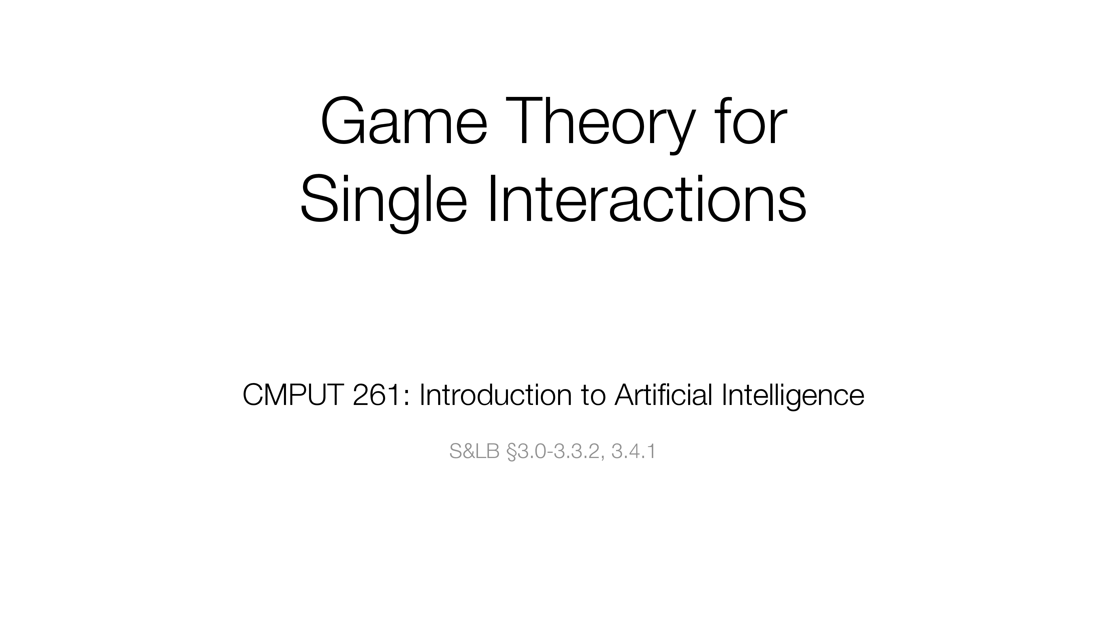 Computer Science > LECTURE SLIDES/NOTES > Game Theory for Single Interactions CMPUT 261: Introduction to Artificial Intelligence LECTURE NOTES | 1. Logistics & SPOT 2. Recap 3. Game Theory 4. Solution Concepts 5. Mixed Strategies 6. Minimax Strategies